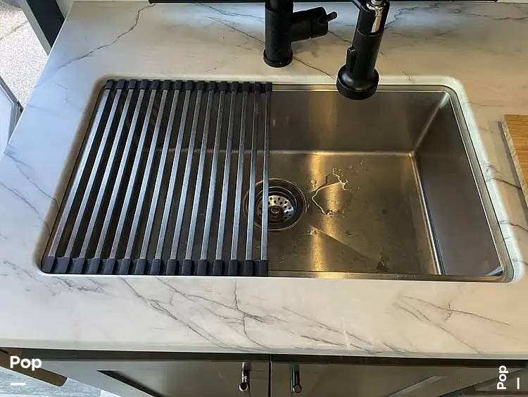There is a full galley with a large sink, stove, oven, microwave, residential-size fridge, and sleeper dinette with plenty of storage space.