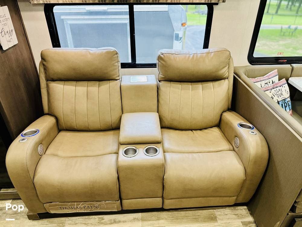Inside, you'll find a roomy layout, two bathrooms, a king-sized bed, and a comfortable living area with 2 recliners with massage and heat features, a TV, and a cozy fireplace.