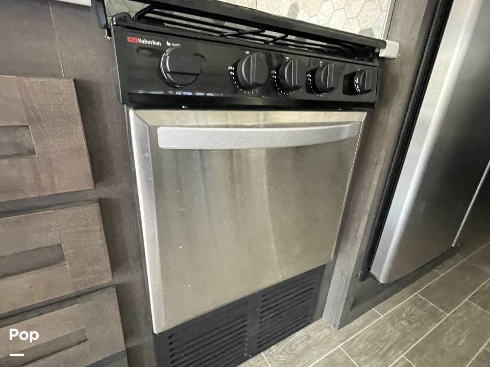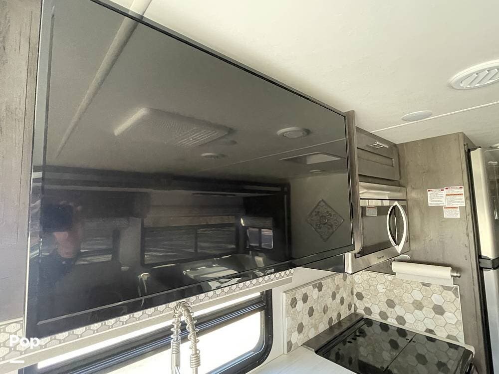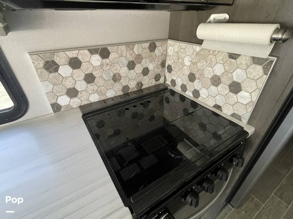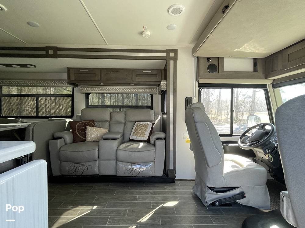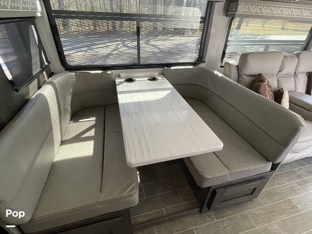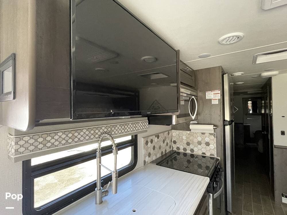 Inside, the living area is spacious and inviting, featuring high-quality furnishings and a modern design. The comfortable sofa/recliner provides the perfect place to unwind after a long day of exploring, while the U-shaped dinette offers plenty of seating for meals, board games, or planning your next destination. Large windows allow for plenty of natural light, creating a bright and airy ambiance throughout the interior. Overhead storage compartments provide ample space for keeping essentials neatly organized and within reach.