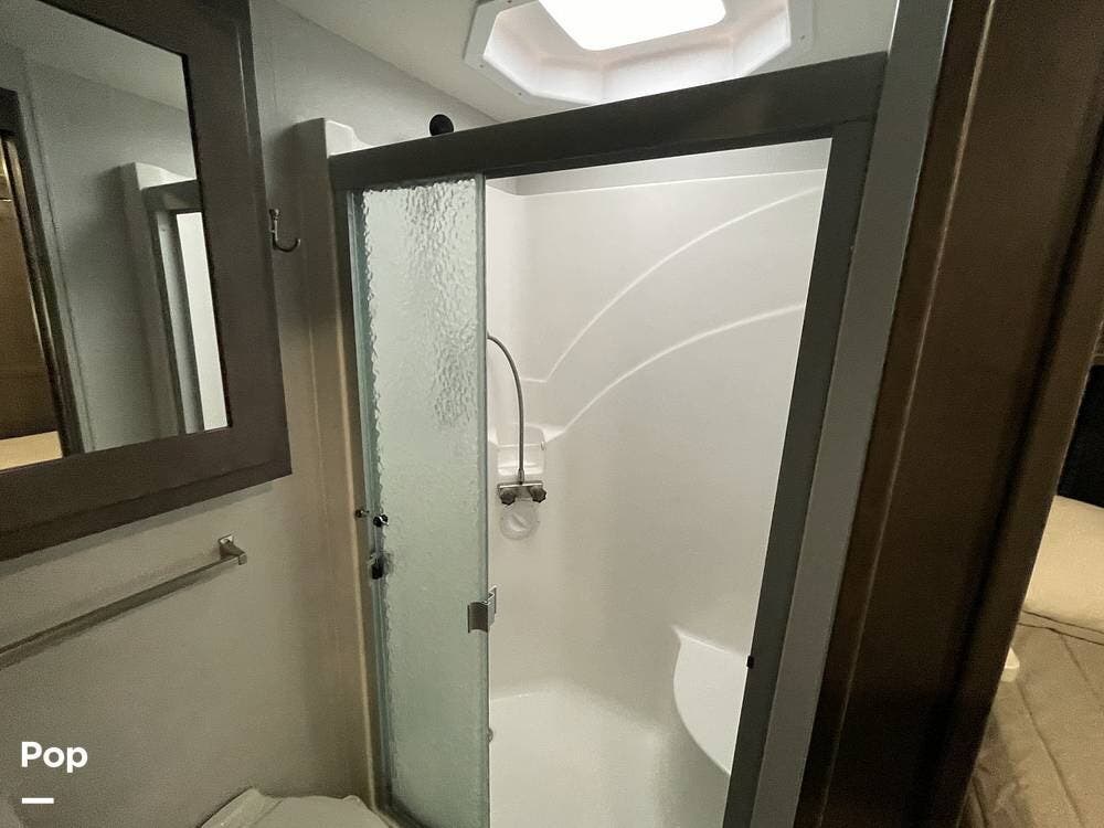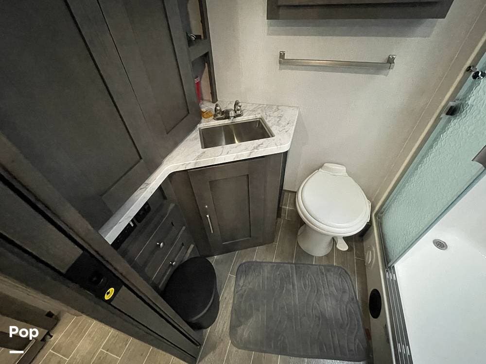 The Georgetown 36B5 is equipped with two full bathrooms, a rare and highly desirable feature in a Class A motorhome. The first full bath is conveniently located across from the bunk beds, making it easily accessible for guests or children. The second full bath is situated in the private primary suite, providing the ultimate convenience and privacy for the owners. With high-end fixtures, spacious showers, and plenty of storage, these bathrooms offer a level of comfort typically found in residential homes.