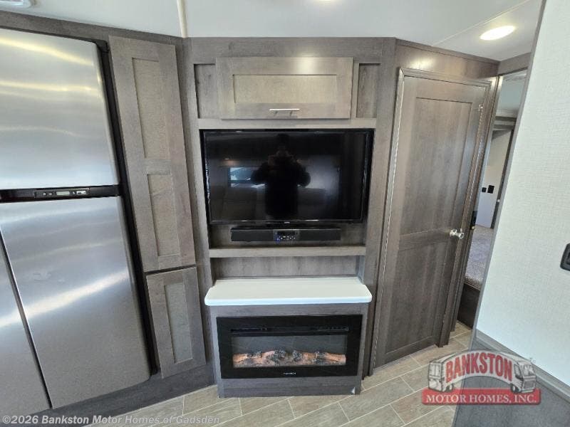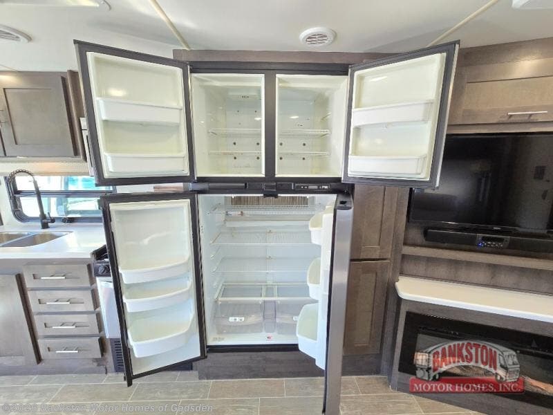 Get ready to enjoy each road trip with this Georgetown 5 Series Class A gas motorhome! You will be amazed at the beauty and attention to detail inside this model. Once you are parked, you will find plenty of room to relax throughout the day between the four-person theater seating and the dream dinette. The super-sized dream dinette is not only the best place to enjoy your meals, but it is also a great place to play a card game or two. While you're relaxing in the theater seating, you can enjoy the cozy fireplace and also watch your favorite movie on the 40" LED TV. If you have a little desk work to do, then the passenger work station is sure to come in handy. A key feature in the kitchen is the 18-cu. ft. refrigerator where you can easily stock up and store your perishables!