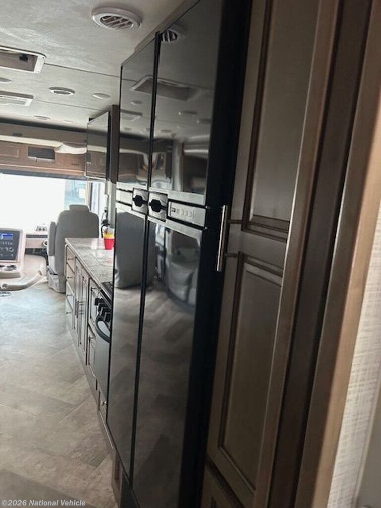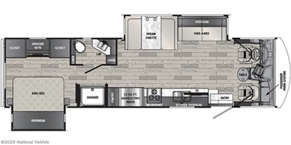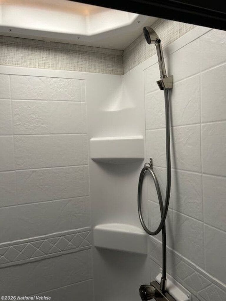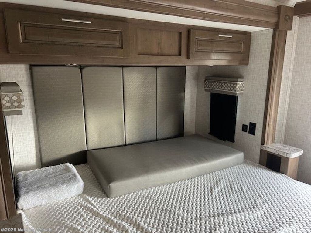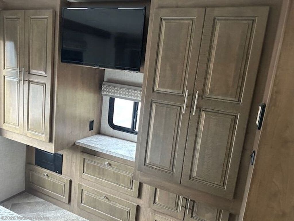 The private rear bedroom offers a relaxing retreat with ample wardrobe storage, while the centrally located bathroom provides a roomy shower and all the essentials for life on the road. Modern touches like multiple TVs, exterior entertainment, and a backup camera add convenience and enjoyment to every trip.