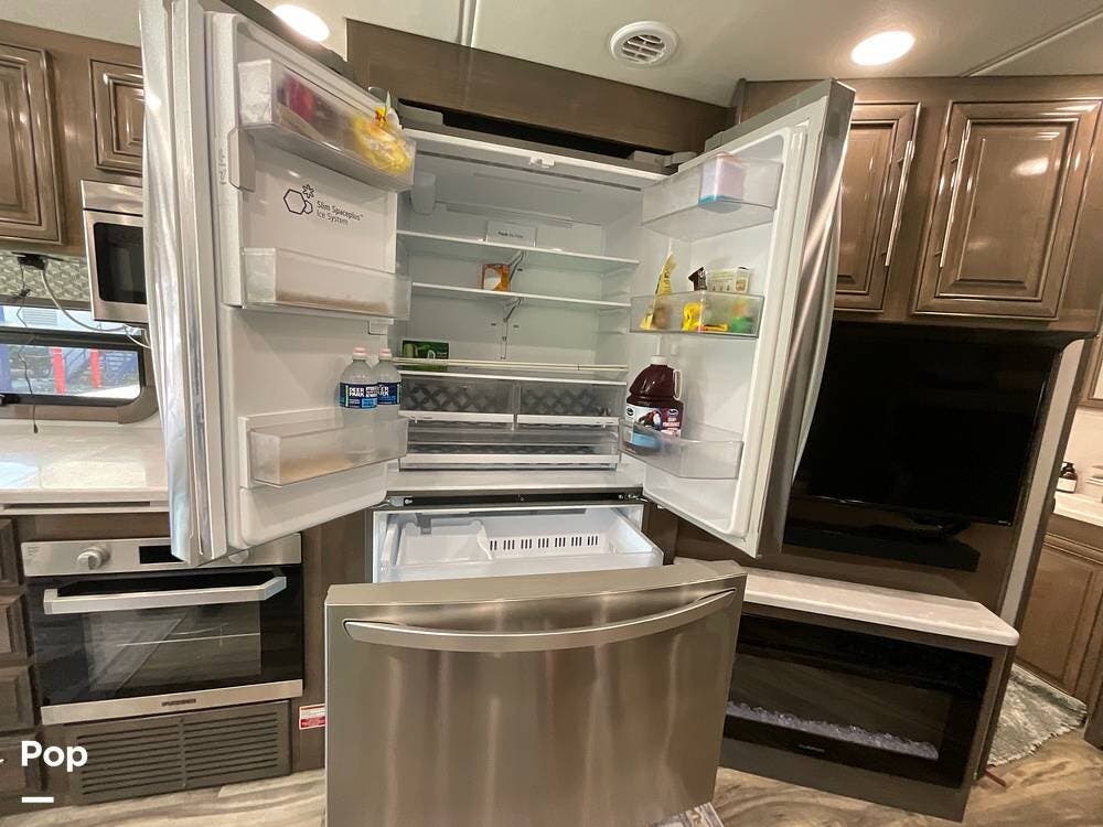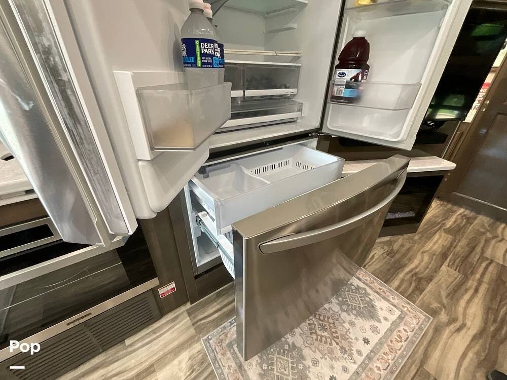 This has all the amenities you could ask for, including two full bathrooms. The living area has recliners and a fireplace. The kitchen has a residential refrigerator freezer with two ice makers, a microwave convection oven, a stove, and an oven, and plenty of cabinets.