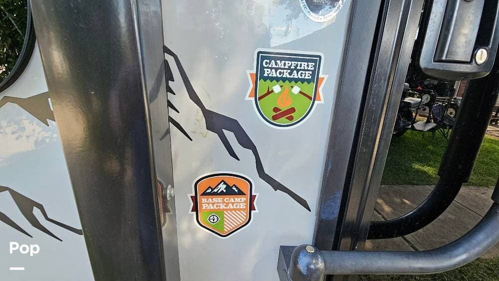 Outdoors, a 15‑foot power awning with integrated LED strip lighting spans the side, while Power Gear frame technology and premium wheel and tire packages ensure stability on the road. Features like external speakers, a backup camera system, a hands‑free baggage door catch, and tire pressure monitoring add smart convenience.