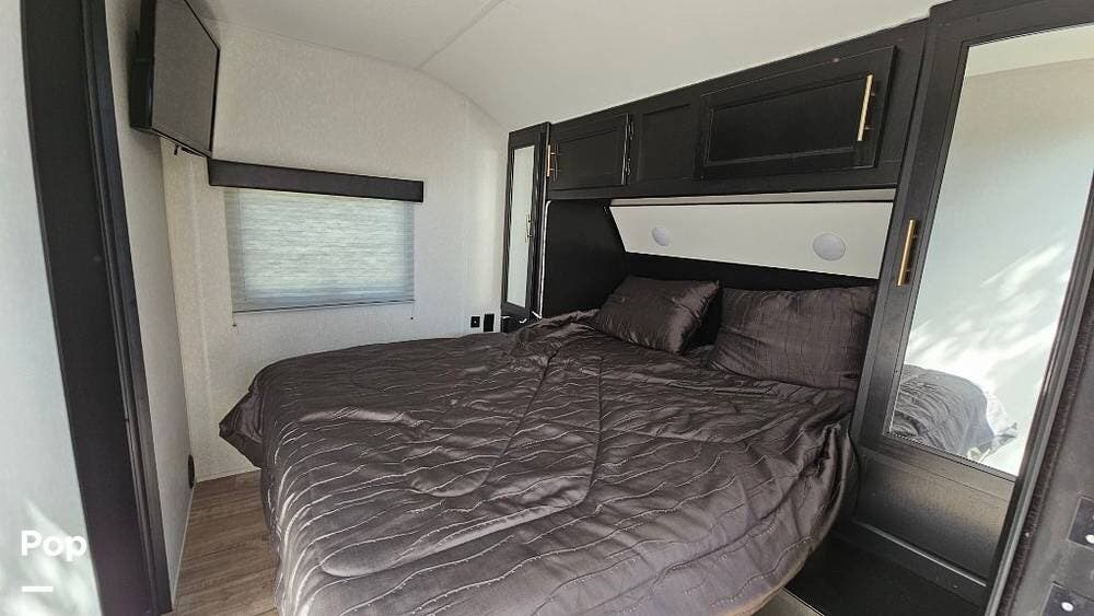 The 2021 Grey Wolf Black Label 26MBRRBL is a mid‑33‑foot toy hauler travel trailer built for both comfort and cargo.