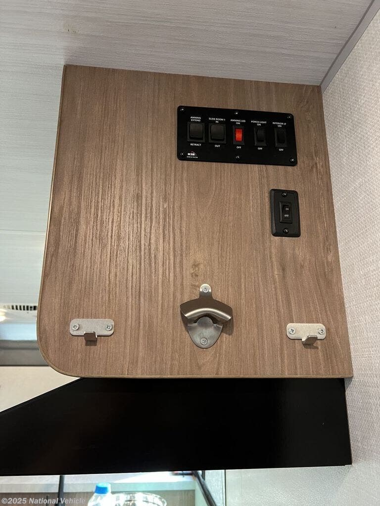 If you haven't experienced the versatility of a Murphy queen bed that can fold out when you need it at night and hide away during the day when you need the sofa, give it a try! You will also find a sofa on the single slide that pushes out to reveal more interior living space. The breakfast bar provides countertop space for dining or visiting with the cook. This can be the perfect couple's trailer, yet a child or guest can sleep on the sofa. Everyone can take turns getting cleaned up in the radius shower in the rear corner bathroom, and some campers can hang out outdoors under the 16' power awning that offers an outdoor living area once you add your camping chairs.