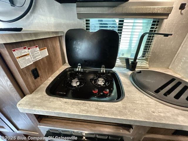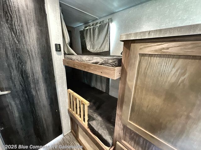 Looking for adventure with your family in a non-slide trailer? Well, you have found it! The rear corner set of 31" x 74" bunks will be the kids' favorite place to sleep, the queen bed up front will be yours, and the chaise-style dinette will accommodate one more friend at night. The private shower and toilet room offers privacy for getting ready and getting cleaned up. You can make meals with the two-burner cooktop and store leftovers in the refrigerator, and there is also an exterior pass-through compartment accessible from either side for your larger items such as fishing poles, camp chairs, and charcoal.