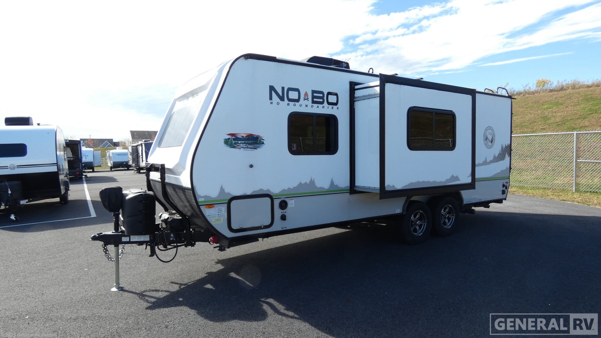 Forest River No Boundaries travel trailer NB19.6 highlights: - Queen Murphy Bed - Two Sofas - Breakfast Bar - Rear Corner Bathroom - Pass-Through Storage - Front Panoramic Window If you haven't experienced the versatility of a Murphy queen bed that can fold out when you need it at night and hide away during the day when you need the sofa, give it a try! You will also find a sofa on the single slide that pushes out to reveal more interior living space. The breakfast bar provides countertop space for dining or visiting with the cook. This can be the perfect couple's trailer, yet a child or guest can sleep on the sofa. Everyone can take turns getting cleaned up in the radius shower in the rear corner bathroom, and some campers can hang out outdoors under the 16' power awning that offers an outdoor living area once you add your camping chairs. The No Boundaries travel trailers and toy haulers by Forest River are easy to tow by a four or six-cylinder vehicle because they range in weights from under 2,000 pounds up to 5,000 pounds. Depending on the model you choose, you will find independent torsion suspension with industry-leading cargo capacity, six-lug satin black aluminum wheels and All-Terrain tires, frame-mounted walkable steel fenders, a laminated Azdel exterior, a Cold Weather package, and a fully walkable 500-LB roof with PVC roofing membrane. The interior offers an exclusive central vacuum system plus much more! You will find a NOBO in a 10 Series, 16 Series or a 19 Series to fit your extreme lifestyle, so make your selection today!