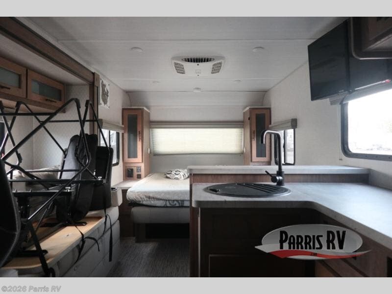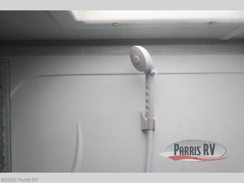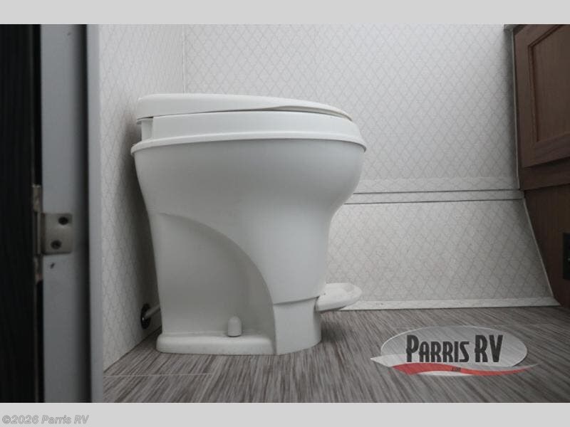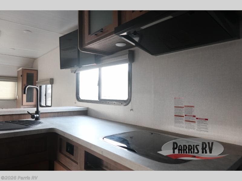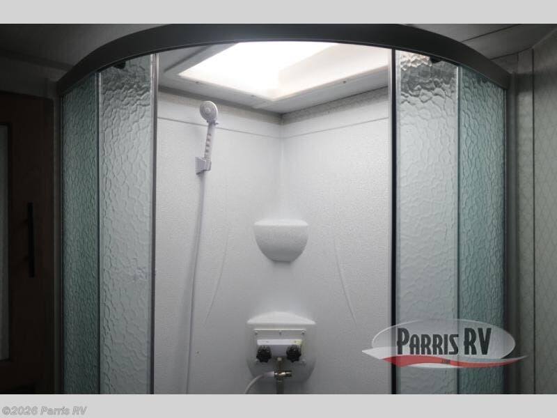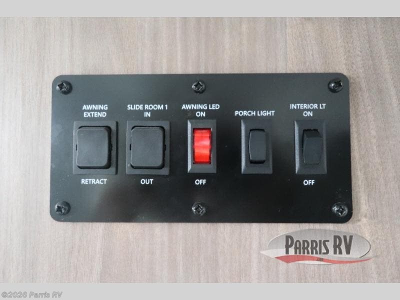 If you haven't experienced the versatility of a Murphy queen bed that can fold out when you need it at night and hide away during the day when you need the sofa, give it a try! You will also find a sofa on the single slide that pushes out to reveal more interior living space. The breakfast bar provides countertop space for dining or visiting with the cook. This can be the perfect couple's trailer, yet a child or guest can sleep on the sofa. Everyone can take turns getting cleaned up in the radius shower in the rear corner bathroom, and some campers can hang out outdoors under the 16' power awning that offers an outdoor living area once you add your camping chairs.