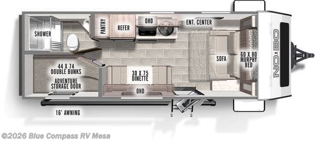 Thank you for visiting Tom's Camperland. Please call 480-894-1267, email or stop by for a tour! The all-new NoBo 19.3 - Come check this thing out! JBL Portable Bluetooth Speaker Complete Interior/Exterior LED Lighting Package LED Entry Step Light 1000 Lumen Amber/White Scare Light Metropolitan Grey Lightweight-Ply Countertops Stainless Steel Utility Hooks Bottle Opener Black Satin Faucet/Door Pulls (where applicable) High Performance Vinyl Furniture 2-Burner Glass Recessed Cook Top Black Stainless Steel Sink (where applicable) Pleated Shades USB Charging Station Lamilux 1000 Fiberglass Exterior Featuring Satin Matte Graphics Custom Front Fiberglass Protective Shell Featuring Tempered Seamless Panoramic Window Roof Mounted Solar Prep 13.5 BTU Low Profile Air Conditioning Power Awning Rear Ladder Azdel Exterior Construction