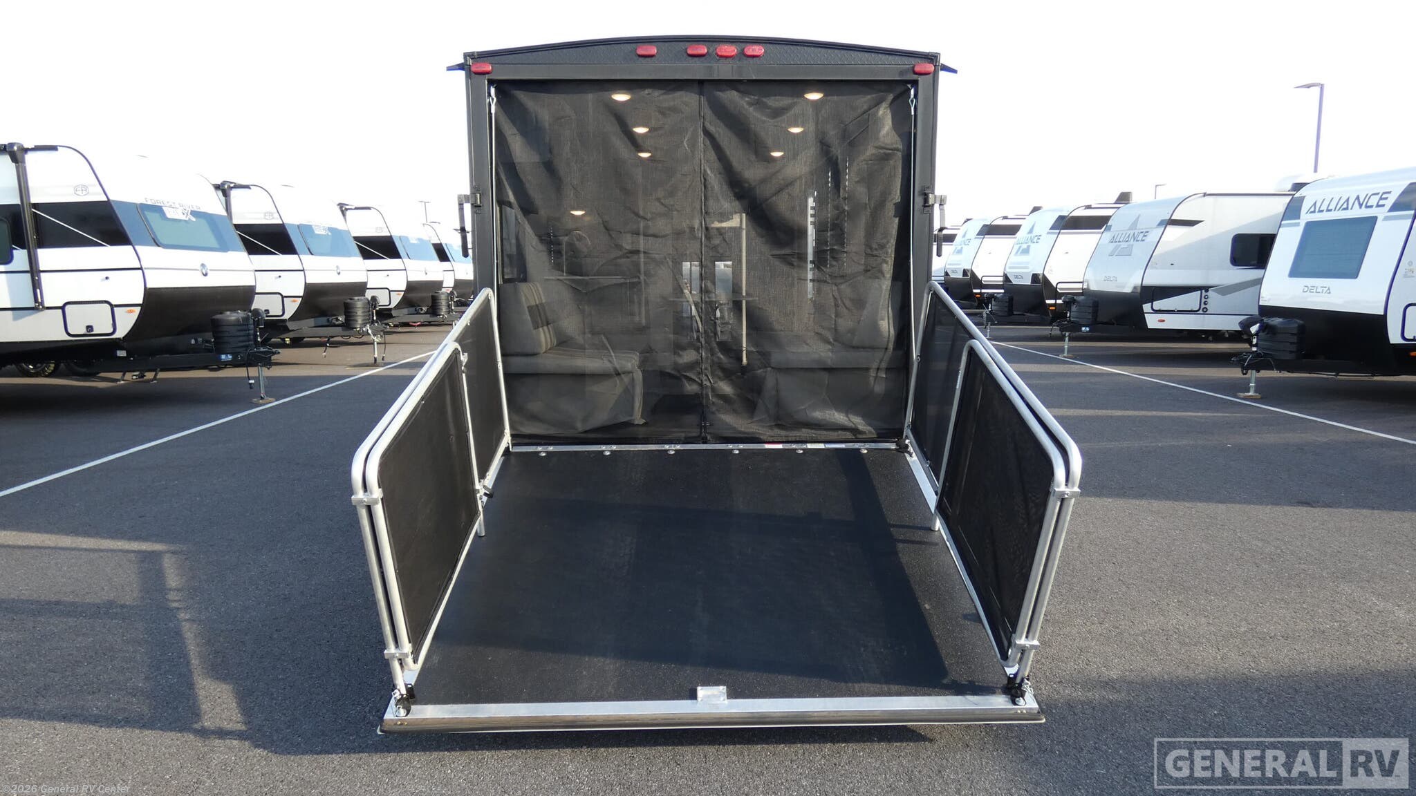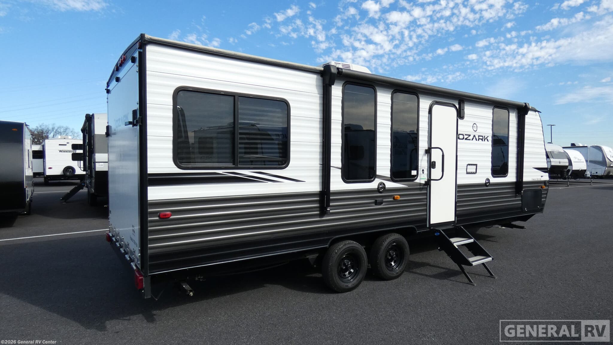 Forest River Ozark toy hauler 2500TH highlights: Private Bedroom Free-Standing Table 13' Garage Pass-Through Storage AM/FM/Bluetooth Stereo Rear Patio Spend a relaxing time away next weekend enjoying your toys with this Ozark toy hauler! Your guests will appreciate that the two flip-out sofas and free-standing table can convert into a comfortable king bed, and you will appreciate having an RV queen bed in the front private bedroom. Everyone will get good use of the 15' power awning with LED lights after grabbing a couple of lawn chairs from the exterior pass-through storage compartment. If the first thing you love to see in the morning are the towering pine trees and the flowing rivers, then don't wait another minute to grab the Forest River Ozark travel trailer or toy hauler! With your very own Ozark towing behind you, there isn't a place that you can't call home. The upgraded TUFFCOAT aluminum exterior and front diamond plate rock guard will protect your trailer, and the durable one-piece linoleum flooring on the interior will be easy to clean when Fido decides to spill his dog food all over the floor. The Ozark has USB charging outlets and preparations for a back-up camera at your convenience, and it also comes with a 20,000 BTU furnace and 13,500 BTU air conditioner to keep the interior always at the right temperature.