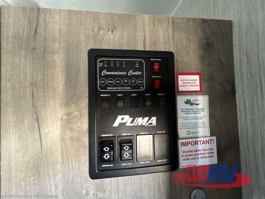 You know it's a great day when it starts with a Palomino Puma travel trailer, fifth wheel, or toy hauler because nothing else is better suited for adventure! There is a Puma for every lifestyle, and there are plenty of features that will enhance each of those lifestyles too. The Puma's construction is better built for lasting performance. The Puma has an AlphaPly roofing membrane, a King HD TV antenna, a smooth, aerodynamic radius front metal with bold exterior graphics, residential-grade carpet with pad on slide outs, and a 5/8" Araucoply plywood floor decking. The Puma also comes packed with value since it gives you the features you need while traveling, like an electric awning with LED lights, preparations for WiFi, a Bluetooth stereo, an enclosed underbelly, an outside shower, and exterior speakers. Plus, the roller shades will help you keep the interior dark and private when you need it to be.