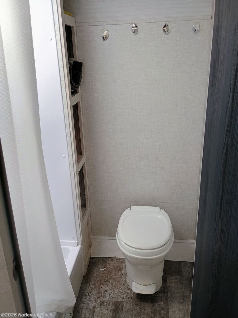The private rear bedroom provides a relaxing retreat with a cozy bed, overhead storage, and USB charging ports for convenience. The spacious bathroom offers a full shower, vanity, and toilet, giving you all the comforts of home wherever you roam.