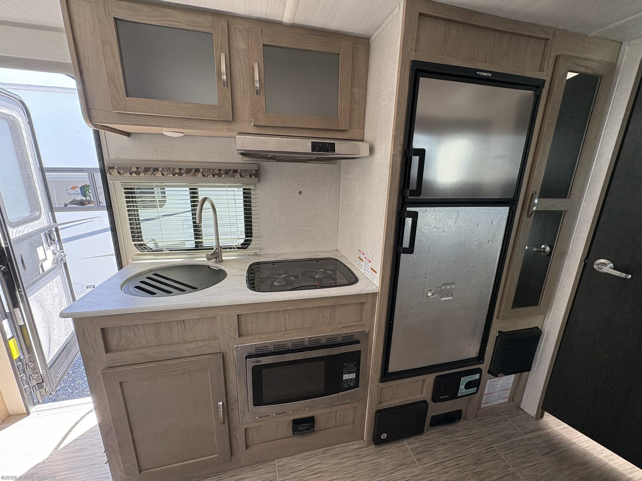 Measuring about 8 feet 0 inches wide and standing 8 feet 9 inches tall, this travel trailer is built for accessible towing and setup. It offers a 30 Amp service connection, self-contained convenience, and includes stabilizer jacks and a power hitch jack for straightforward camping.