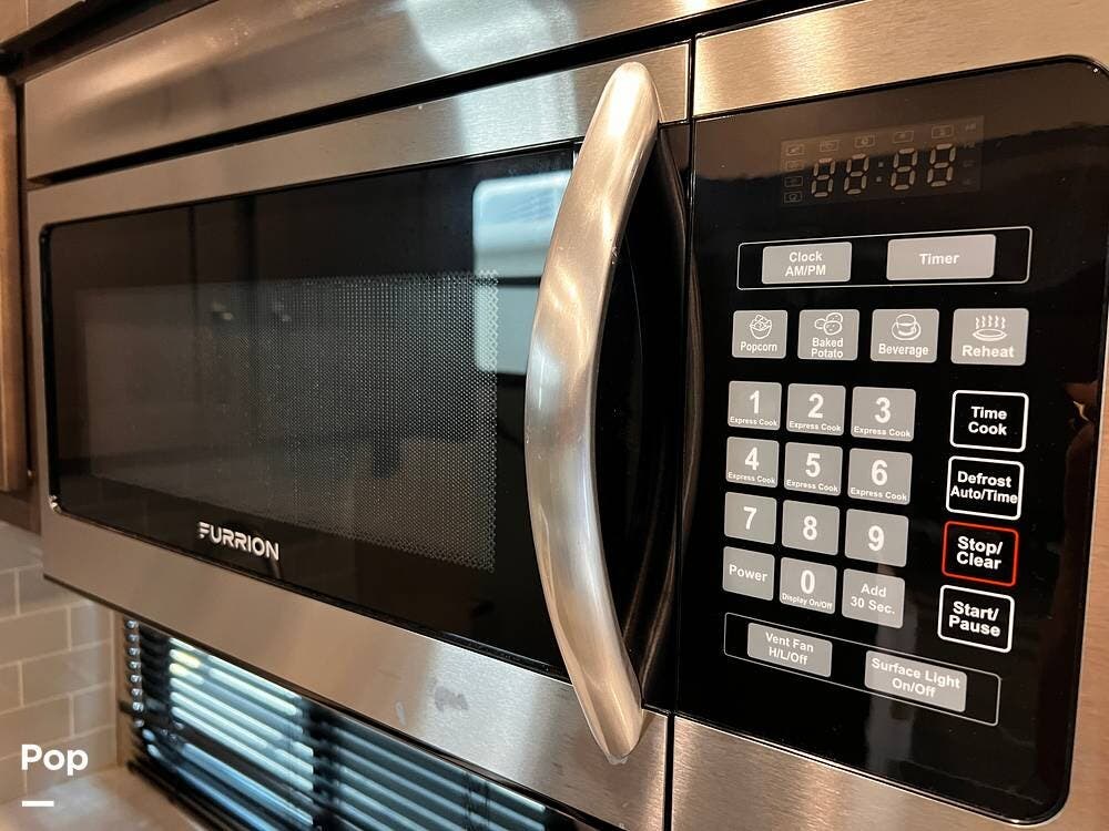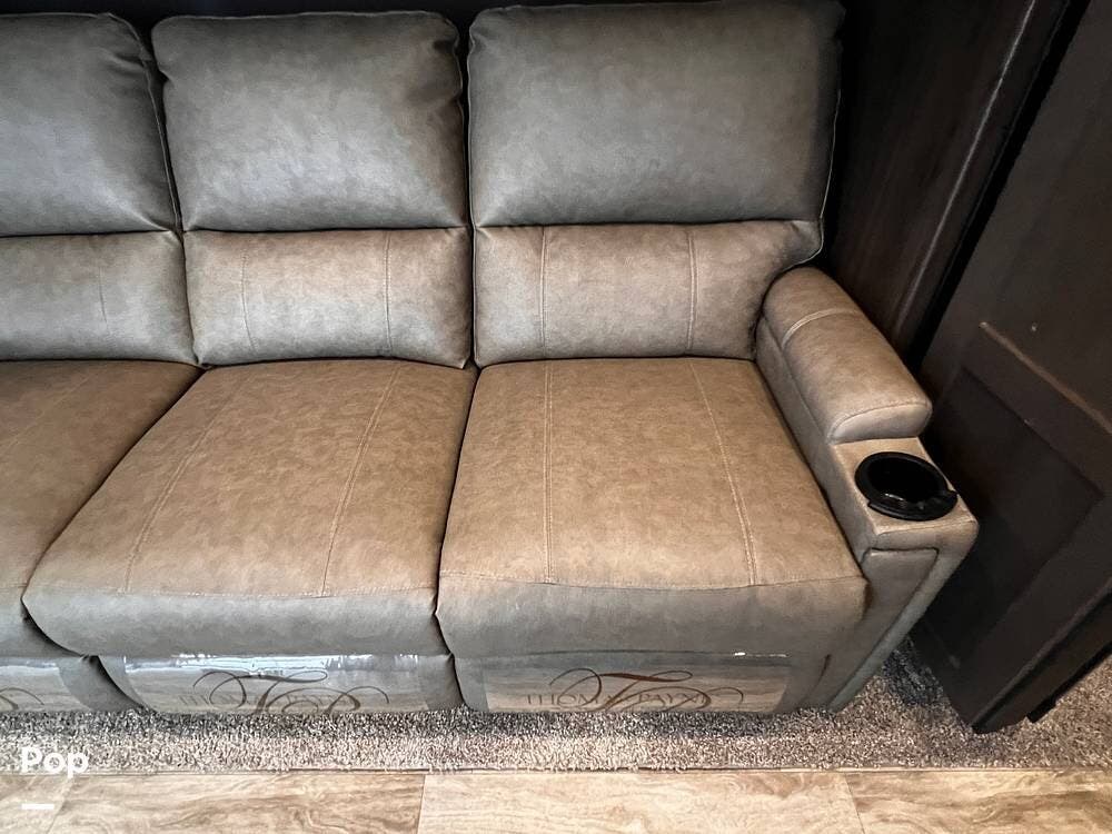 It includes a U-shaped lounge, a large refrigerator (12 cubic feet), Furion kitchen appliances, and reclining theater seating with massage and heat features.