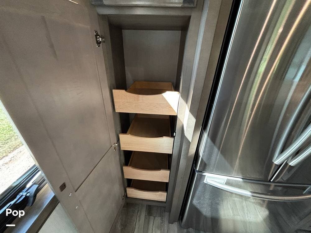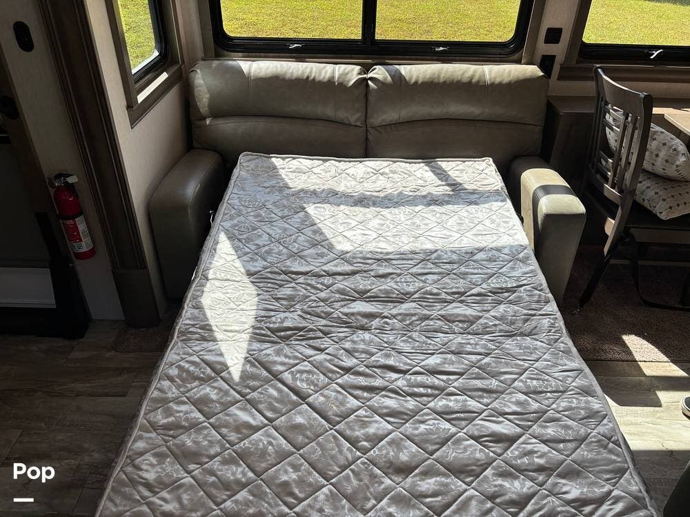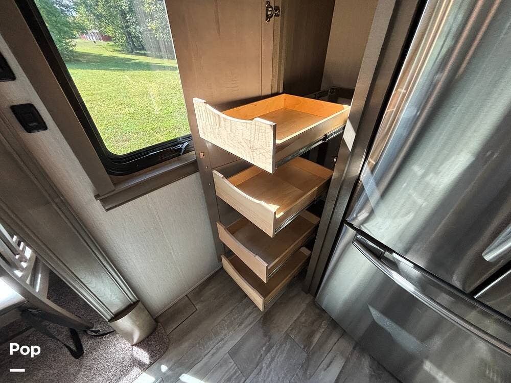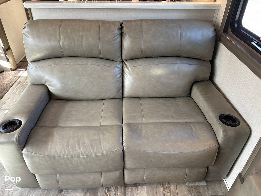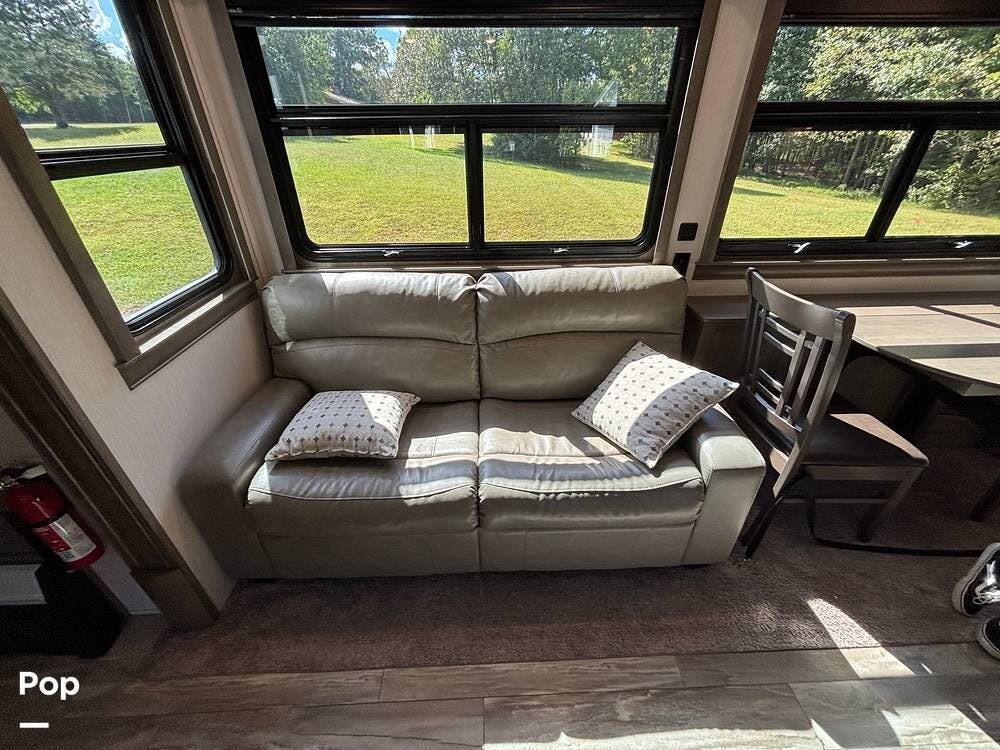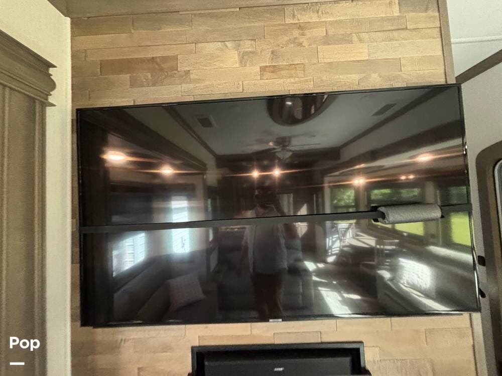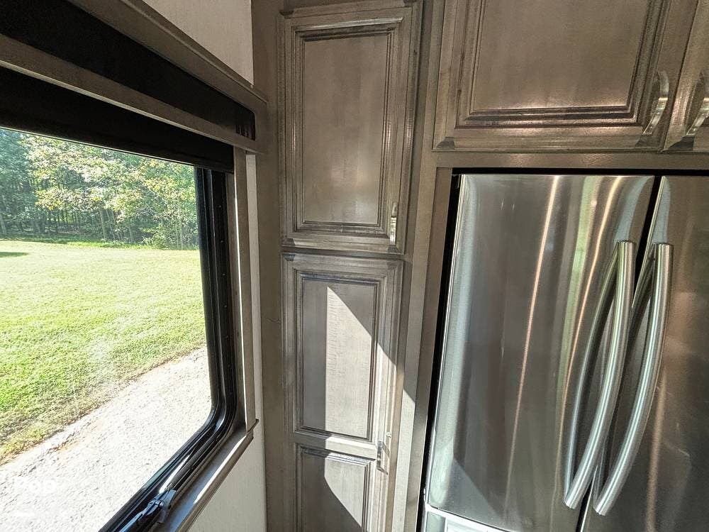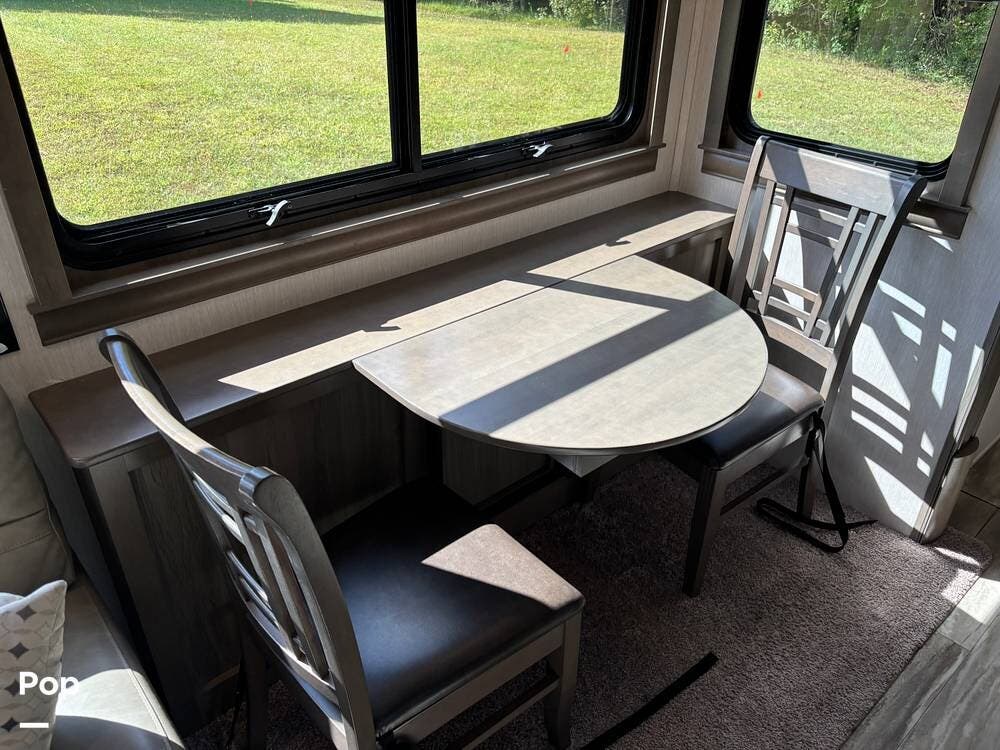 Inside, the living area is bright and open thanks to two slide-outs that expand the space. A comfortable recliner and a full-sized entertainment center create a perfect spot for relaxing or entertaining. Large panoramic windows provide natural light and scenic views, while solid-surface countertops and detailed cabinetry add style without sacrificing function.