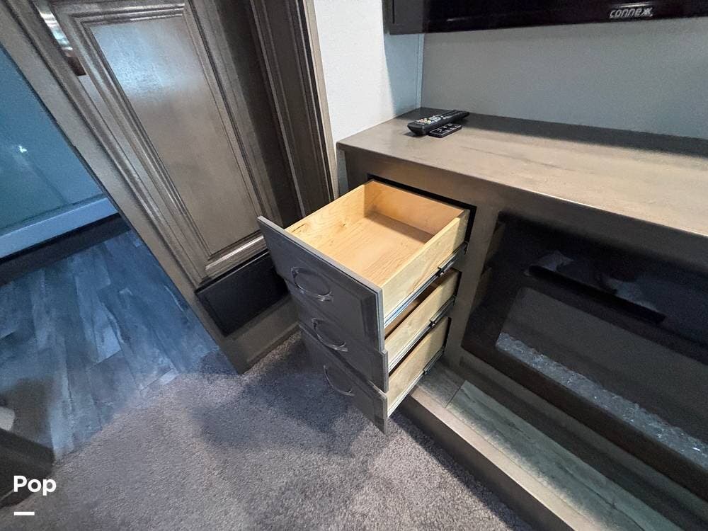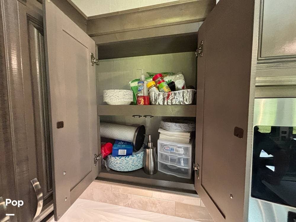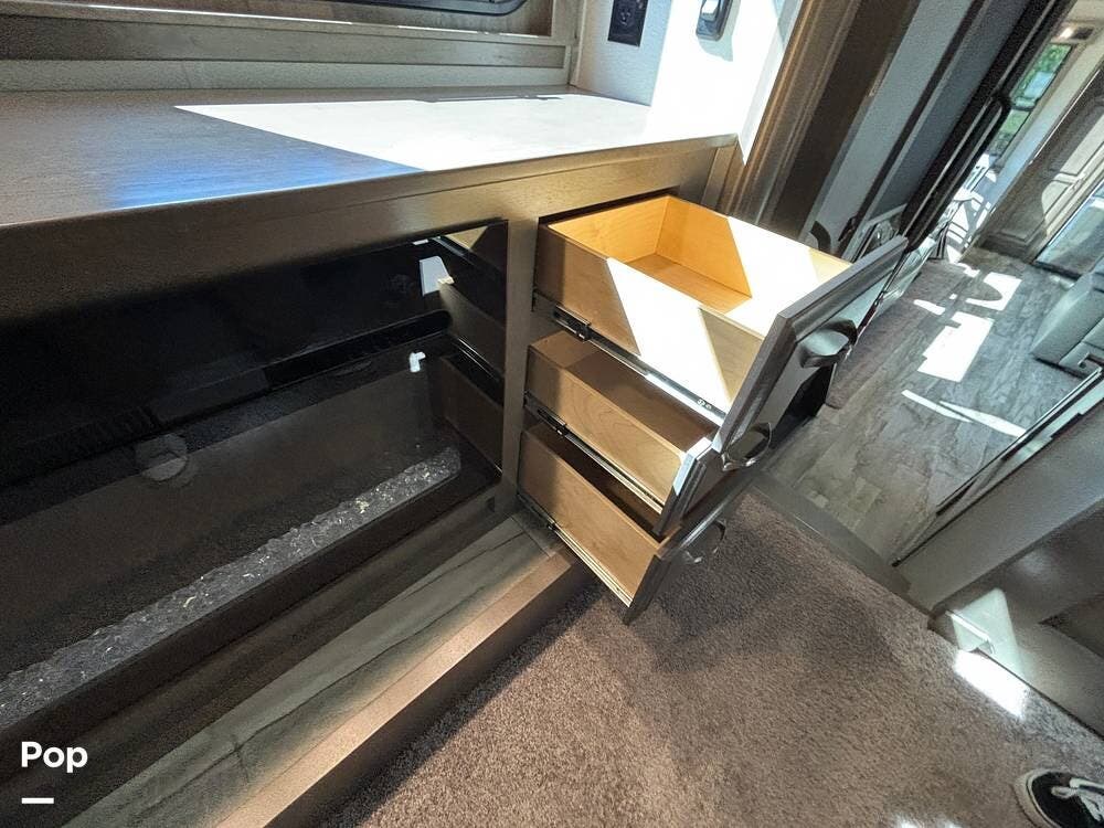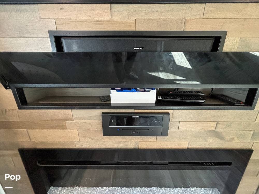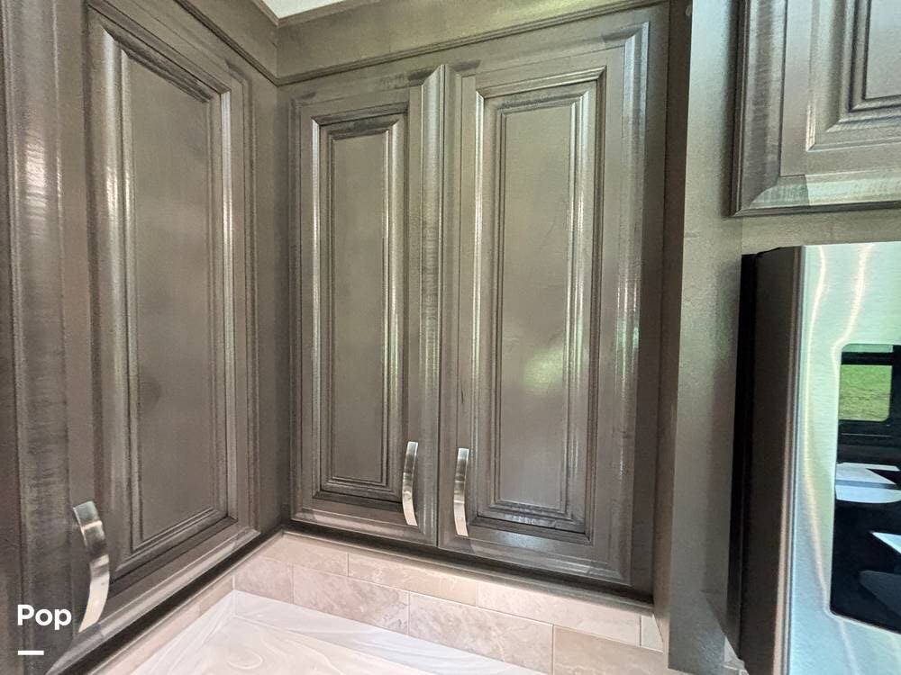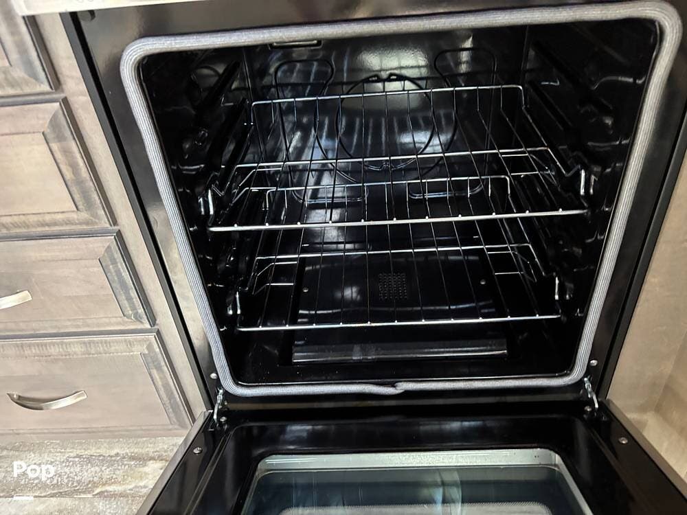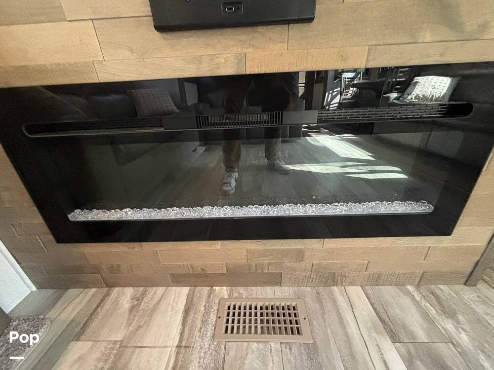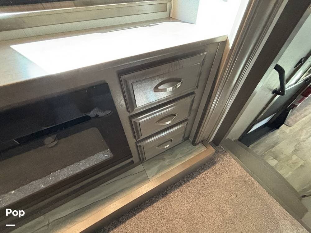 Inside, the living area is bright and open thanks to two slide-outs that expand the space. A comfortable recliner and a full-sized entertainment center create a perfect spot for relaxing or entertaining. Large panoramic windows provide natural light and scenic views, while solid-surface countertops and detailed cabinetry add style without sacrificing function.