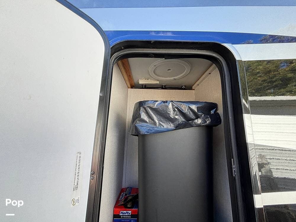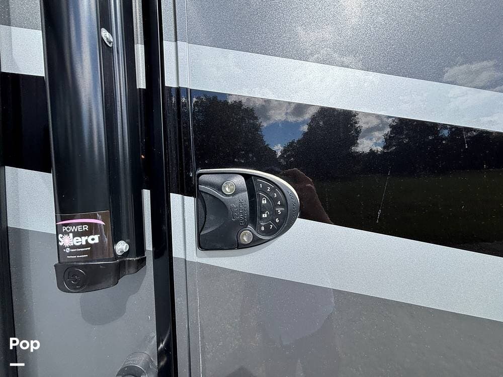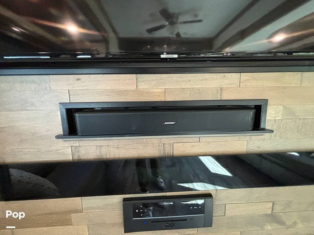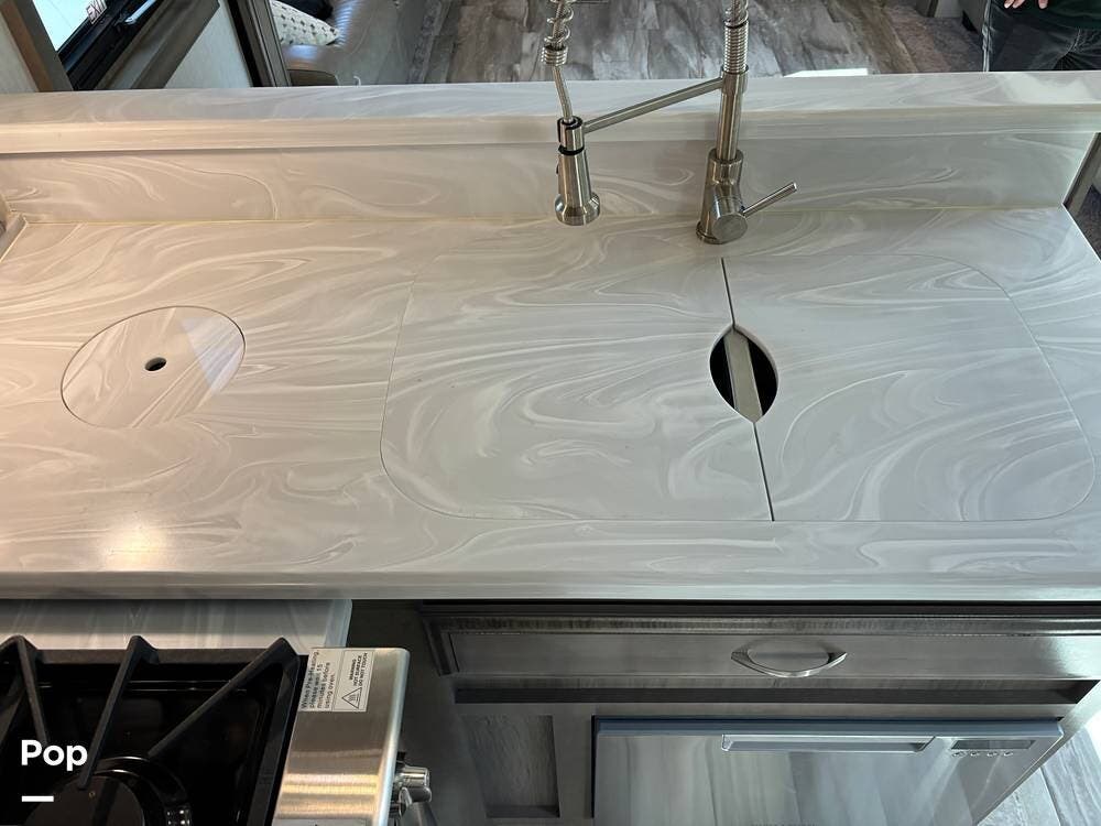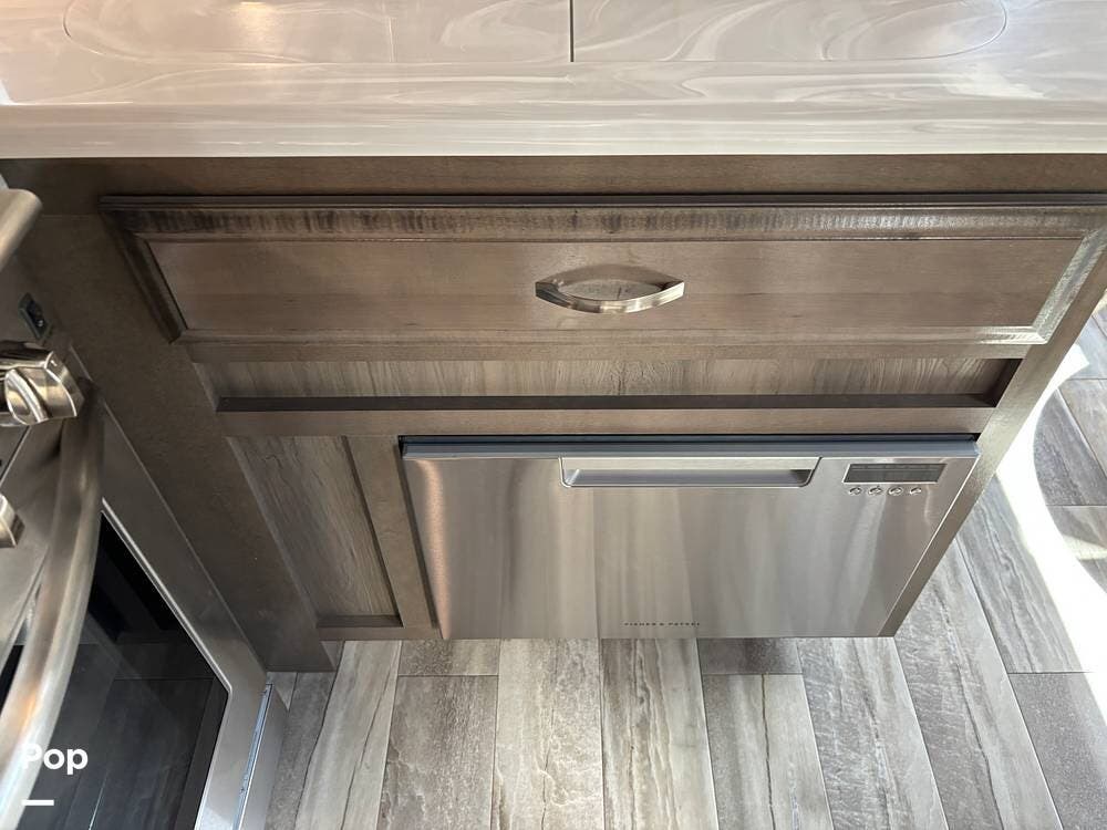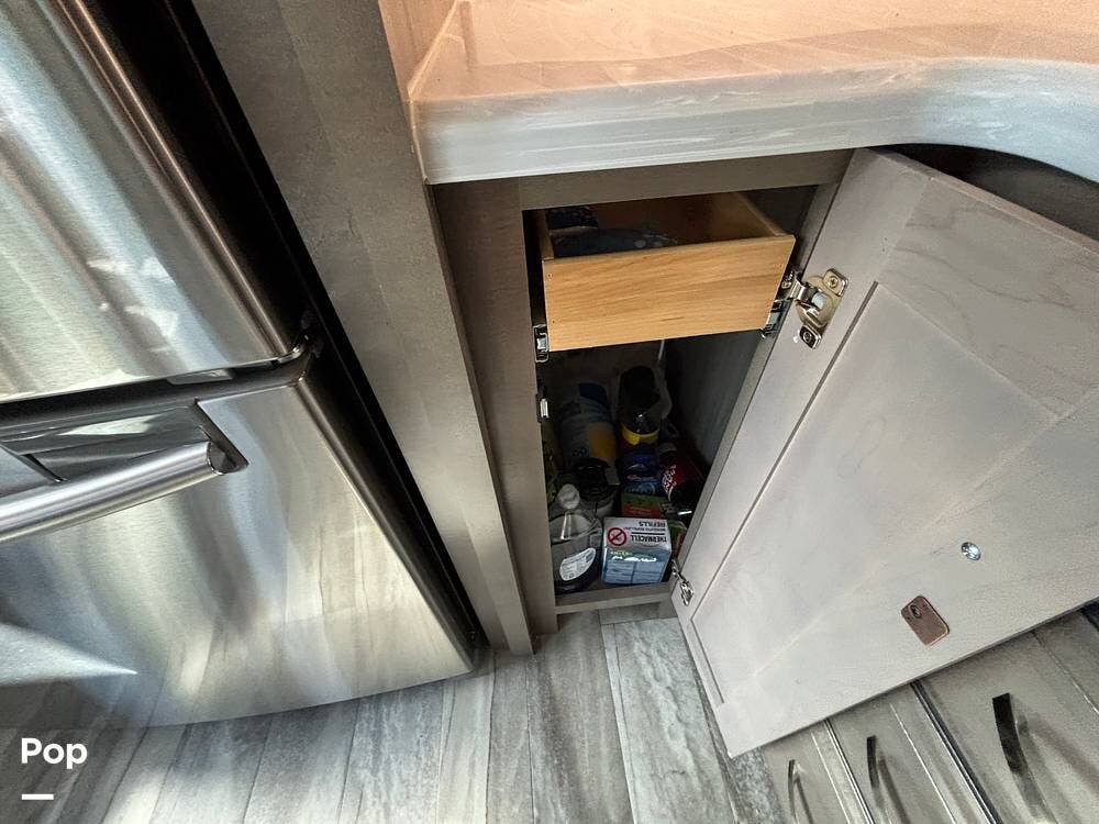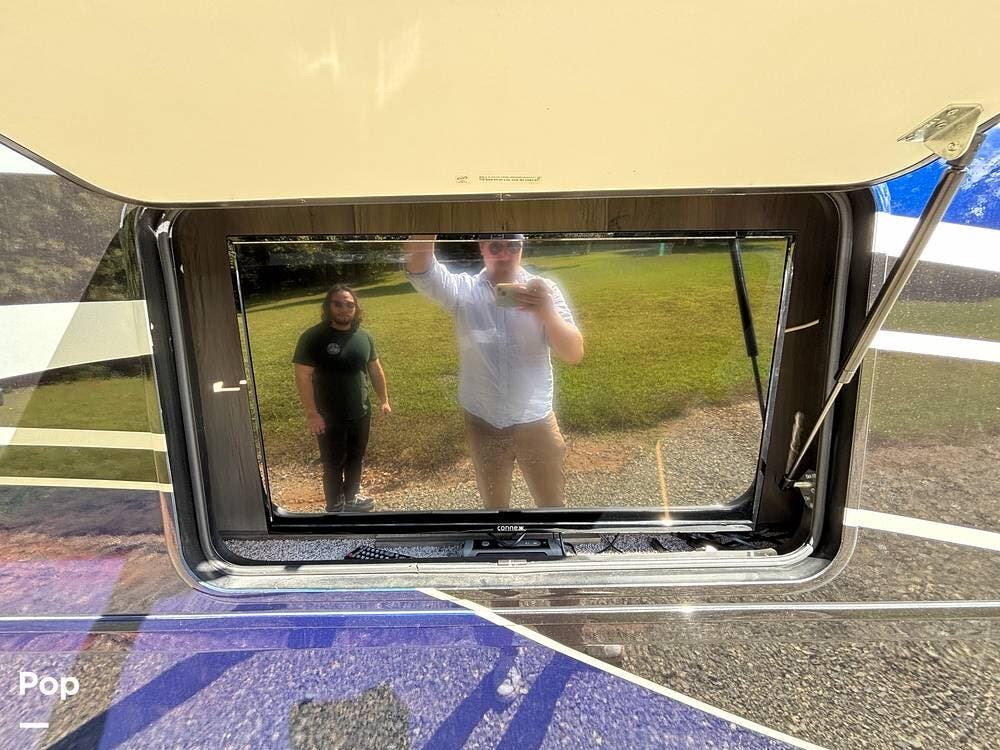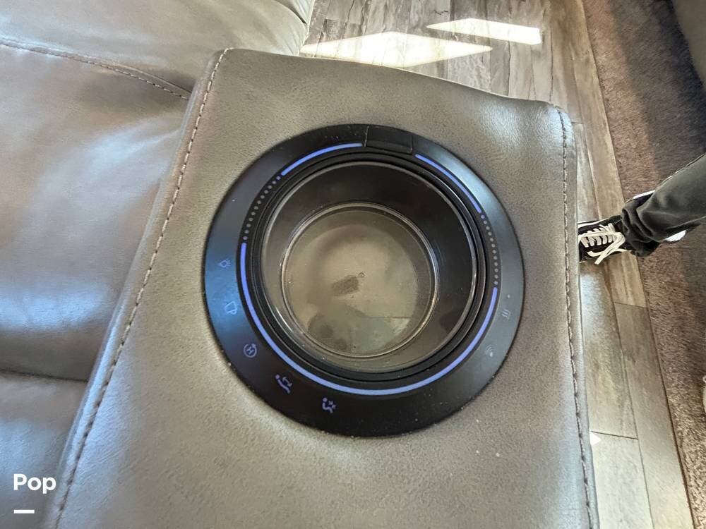 Inside, the living area is bright and open thanks to two slide-outs that expand the space. A comfortable recliner and a full-sized entertainment center create a perfect spot for relaxing or entertaining. Large panoramic windows provide natural light and scenic views, while solid-surface countertops and detailed cabinetry add style without sacrificing function.
