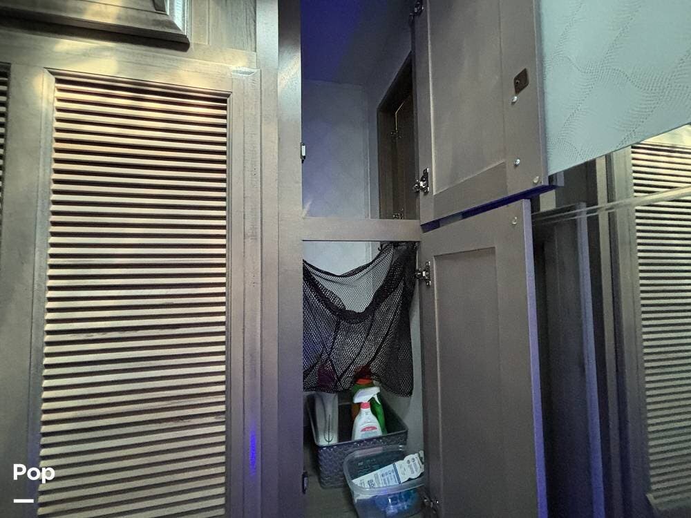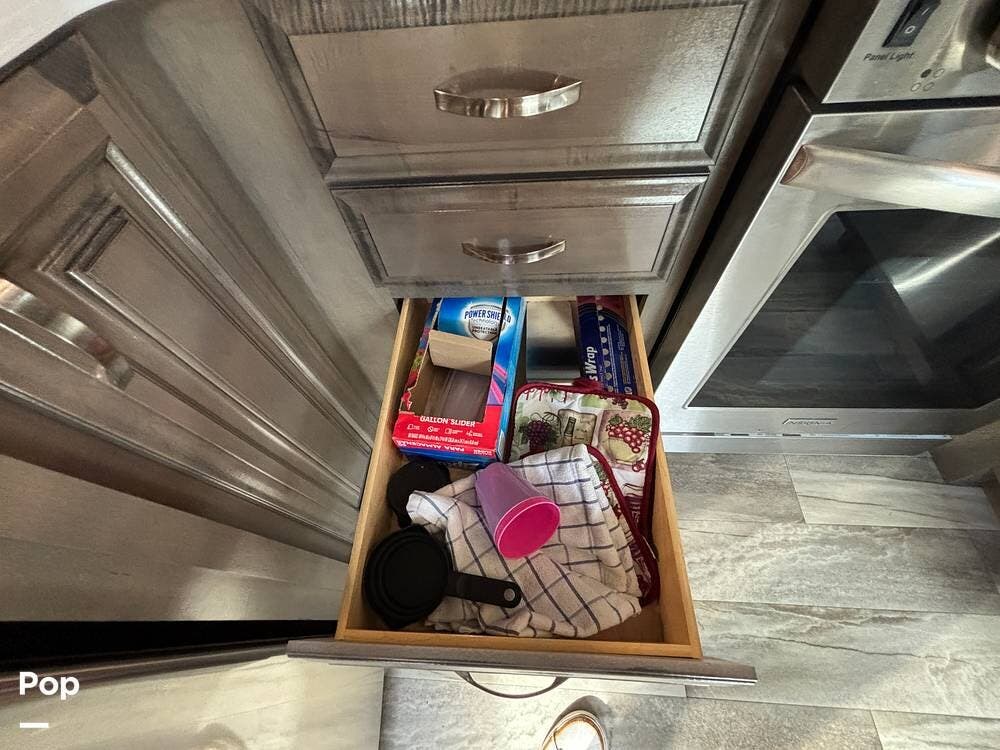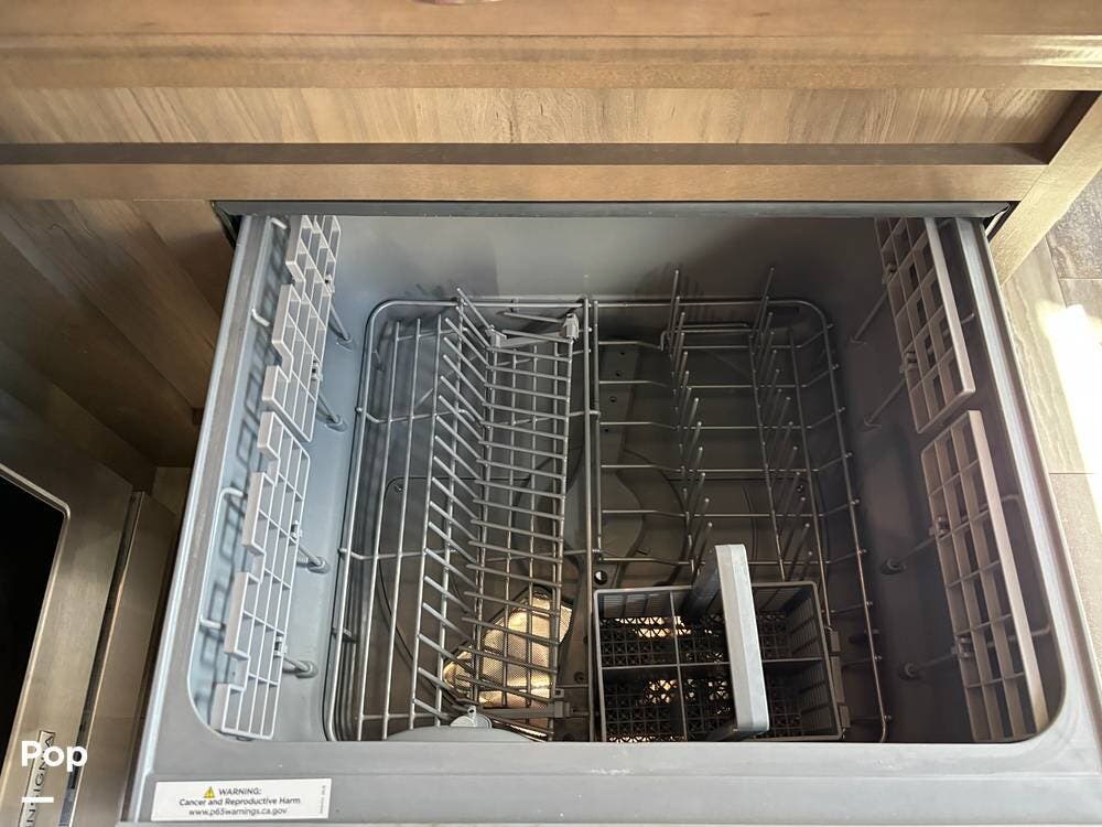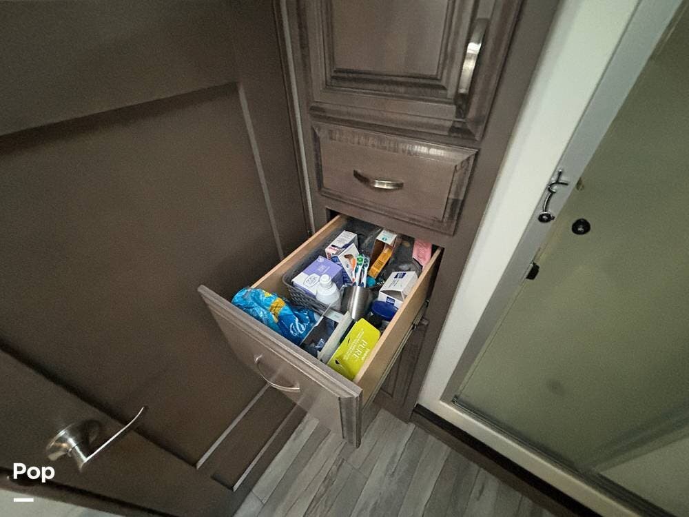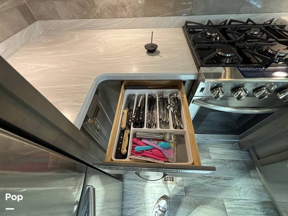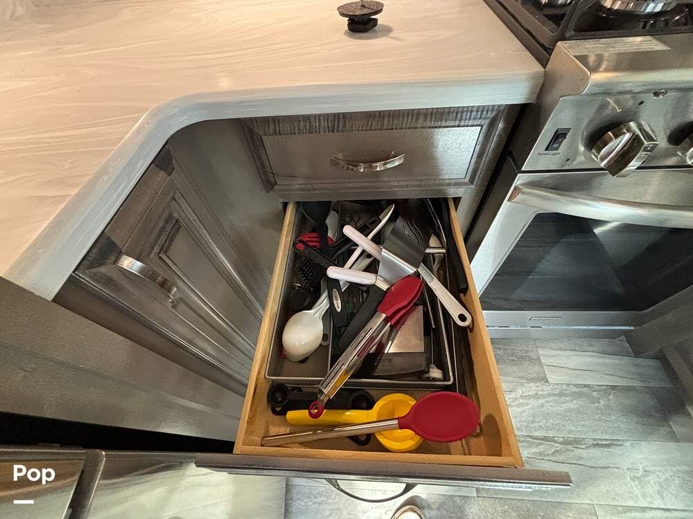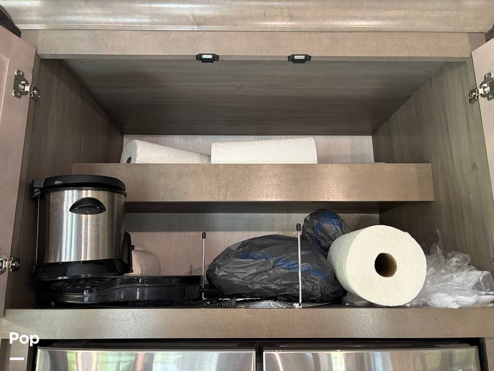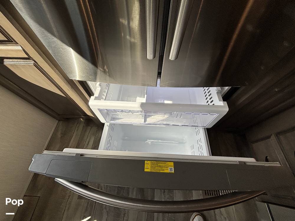 Inside, the living area is bright and open thanks to two slide-outs that expand the space. A comfortable recliner and a full-sized entertainment center create a perfect spot for relaxing or entertaining. Large panoramic windows provide natural light and scenic views, while solid-surface countertops and detailed cabinetry add style without sacrificing function.