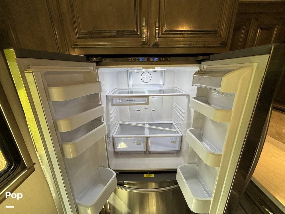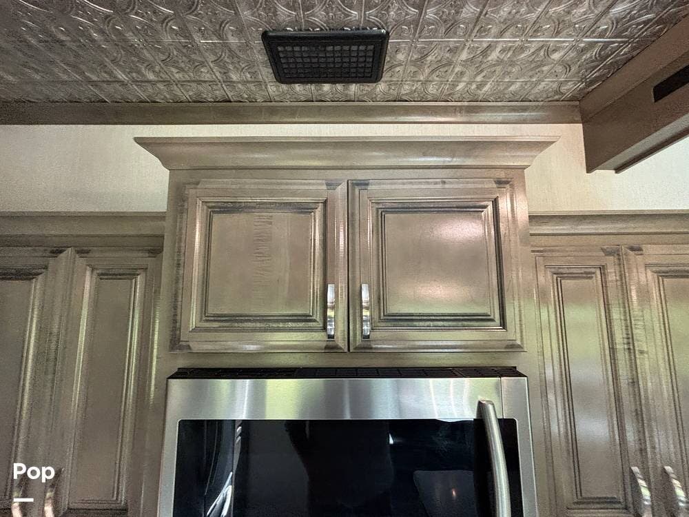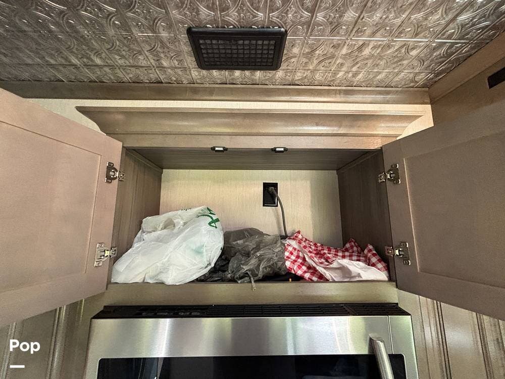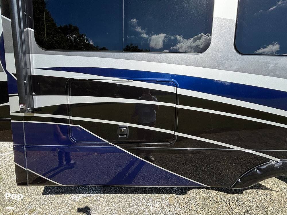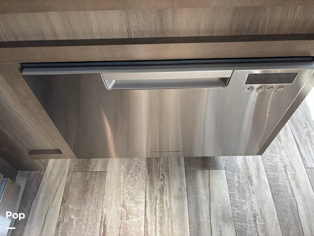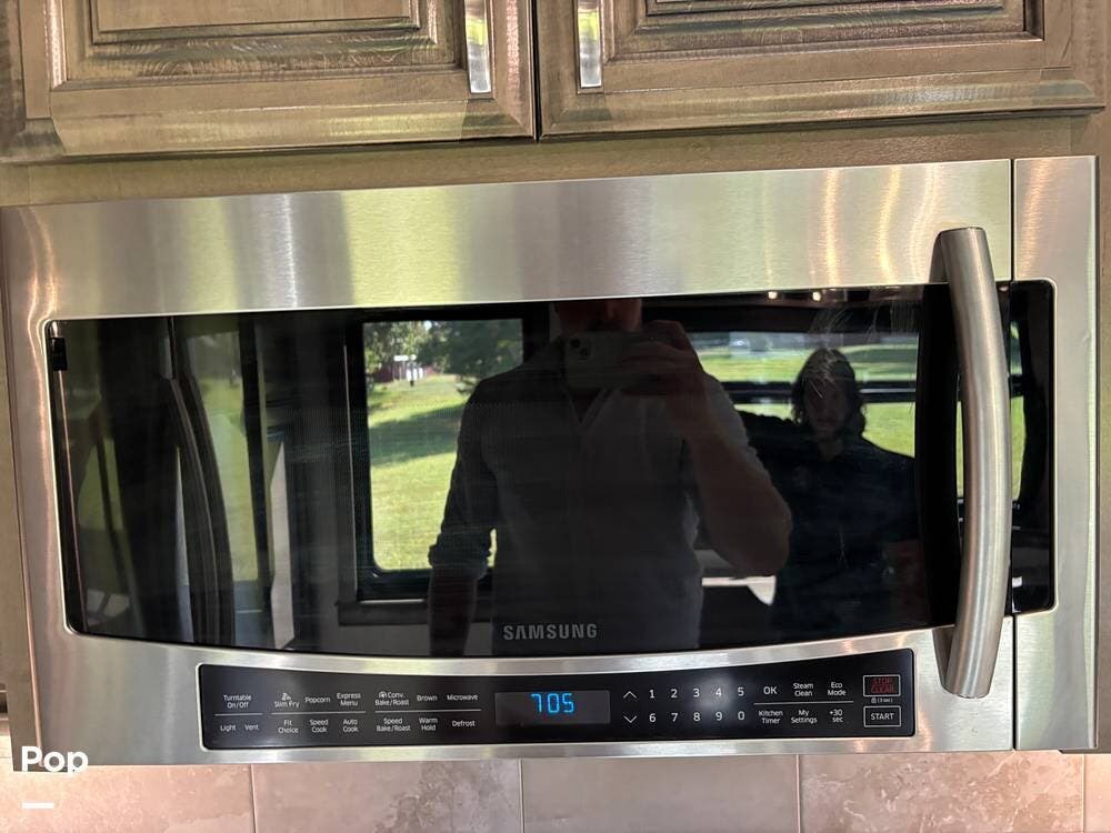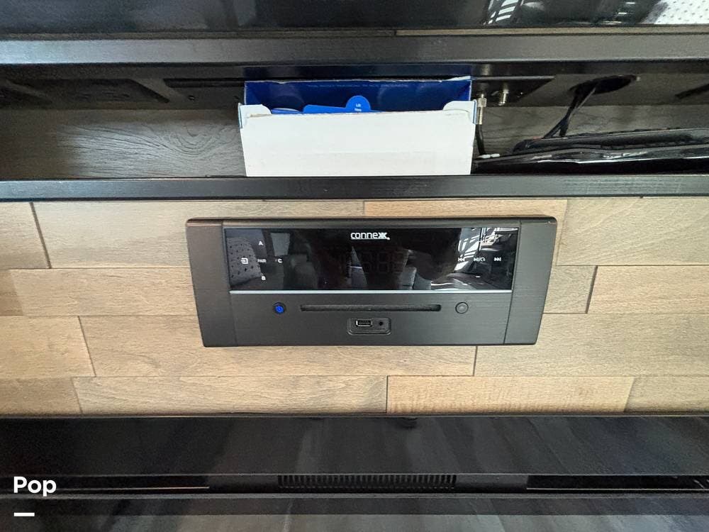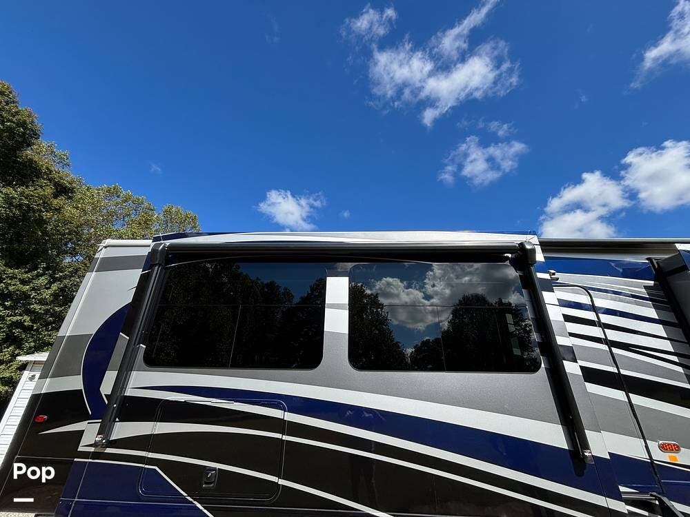 Inside, the living area is bright and open thanks to two slide-outs that expand the space. A comfortable recliner and a full-sized entertainment center create a perfect spot for relaxing or entertaining. Large panoramic windows provide natural light and scenic views, while solid-surface countertops and detailed cabinetry add style without sacrificing function.