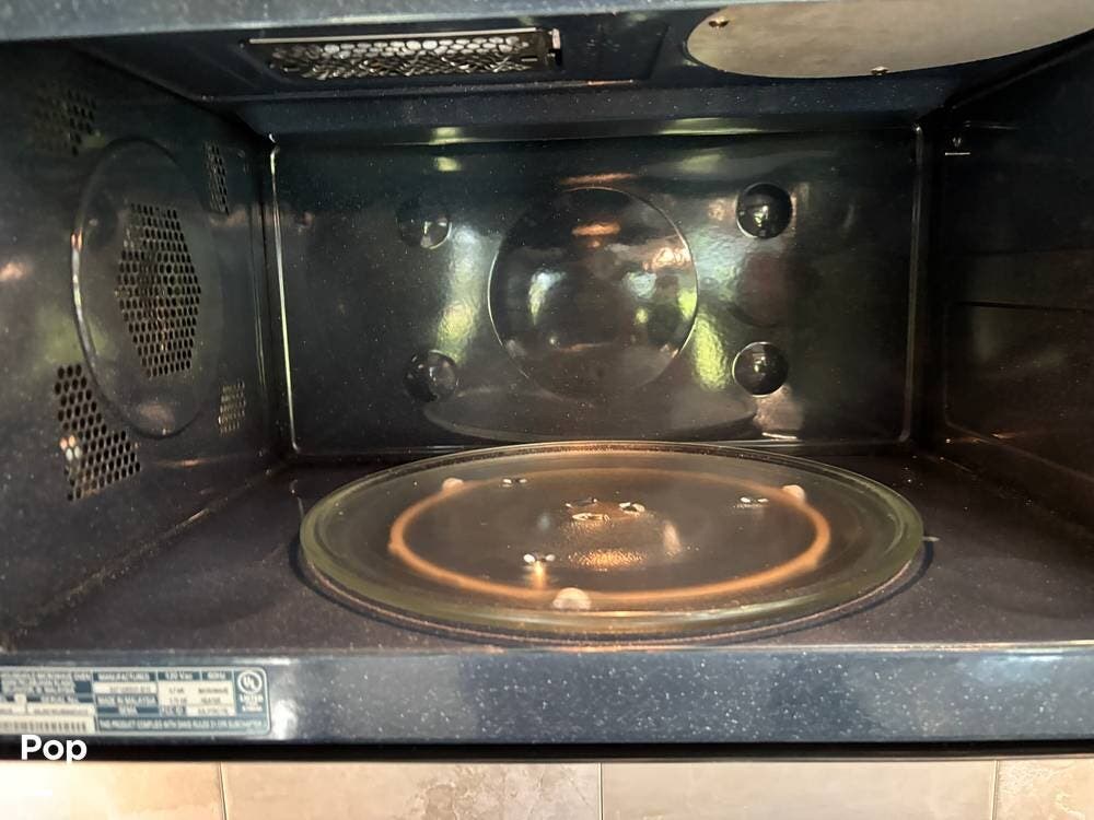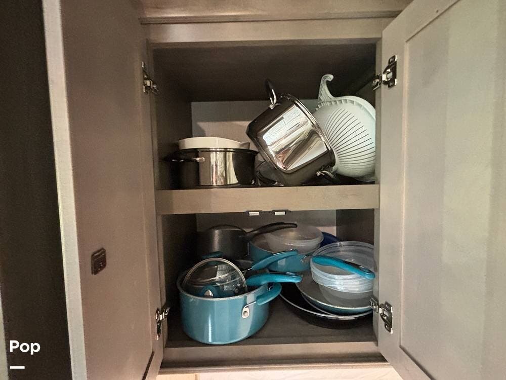 The kitchen is thoughtfully laid out to make meal prep simple and enjoyable. It includes a 4-burner propane stove, a convection microwave, and a full-size residential refrigerator. Counter space is generous, and cabinetry is placed for easy organization of cookware, utensils, and pantry items, ensuring the kitchen is both practical and inviting.