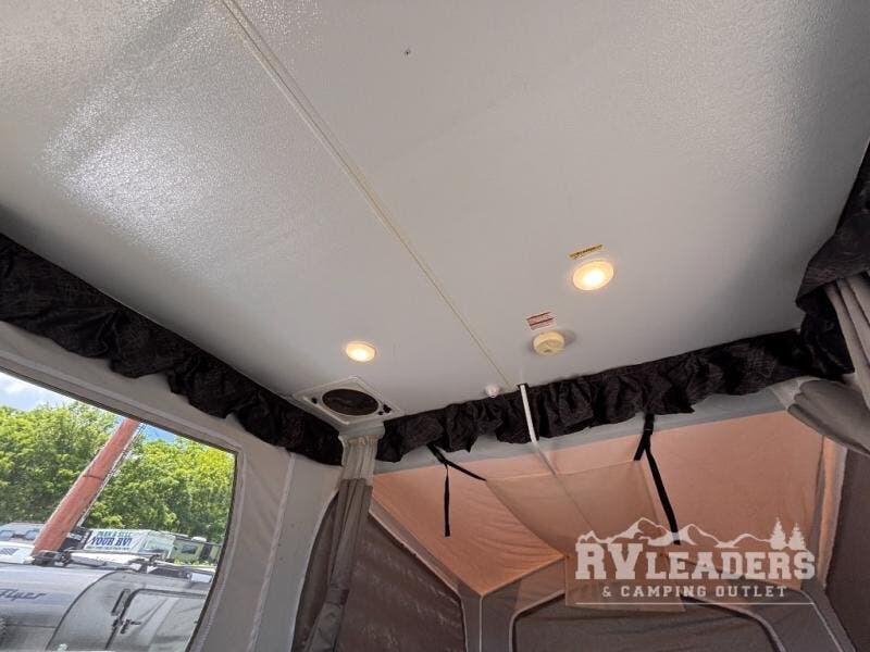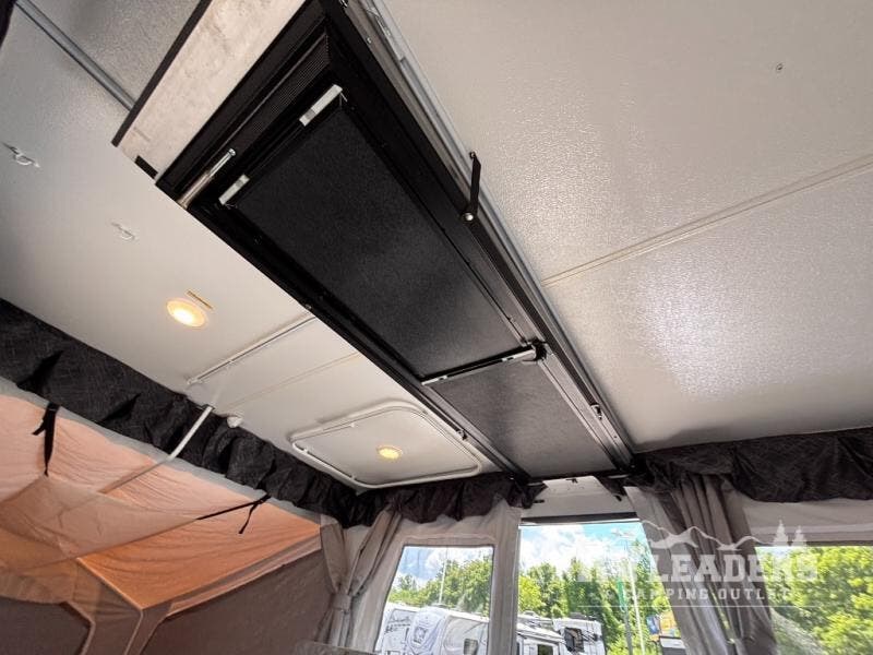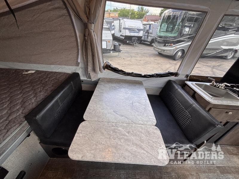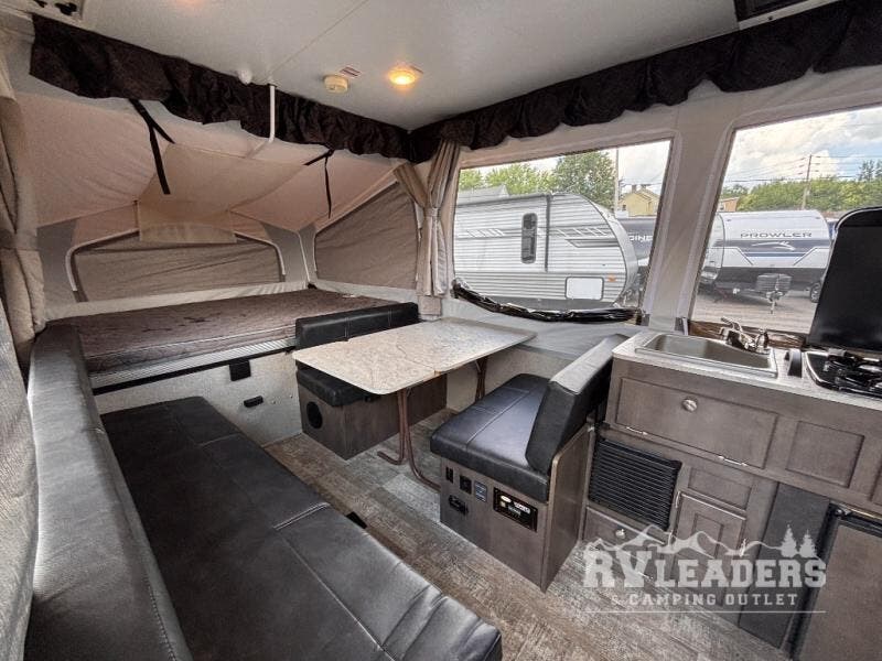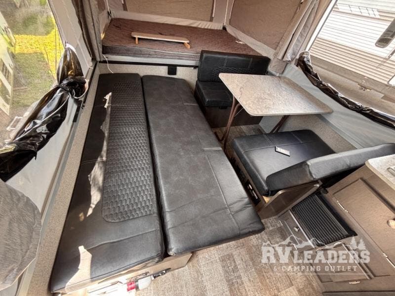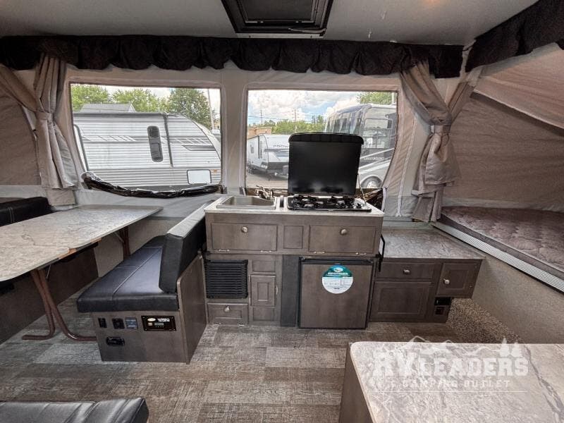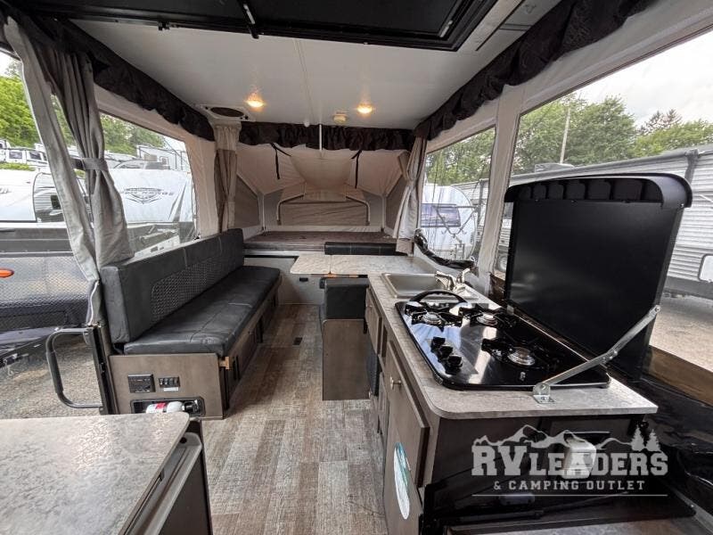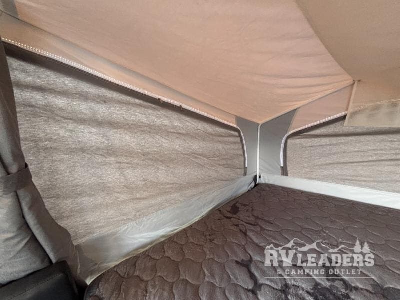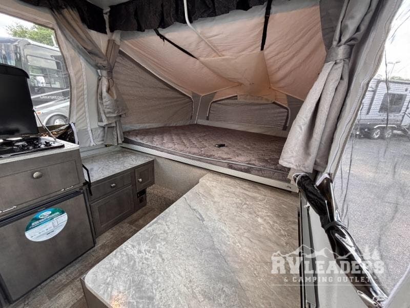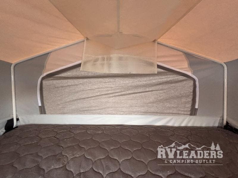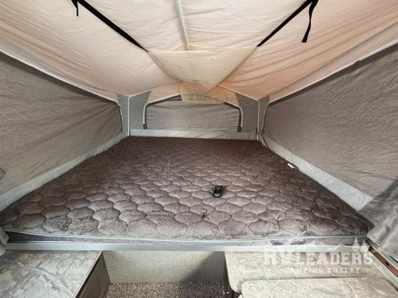 With any Rockwood Extreme Sports Package folding pop-up camper, you will have confidence in the construction from the powder coated tubular steel frame, the three stage double arm lifter post, the fiberglass vacuum bonded radius roof with no center seam, the five-piece Vinolon Supreme tenting, and the full perimeter aluminum bed frames. The ESP Extreme package provides features such as aluminum wheels with 15" Mud Rover tires for better ground-clearance to reach places most RVs wouldn't try, a 100W roof mount solar panel with 1000W inverter, ProRac permanent crossbars, and a power roof lift, plus more. And the interior offers conveniences and comforts while exploring the boundaries. Make your selection today!