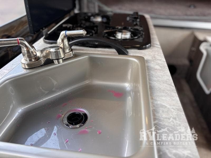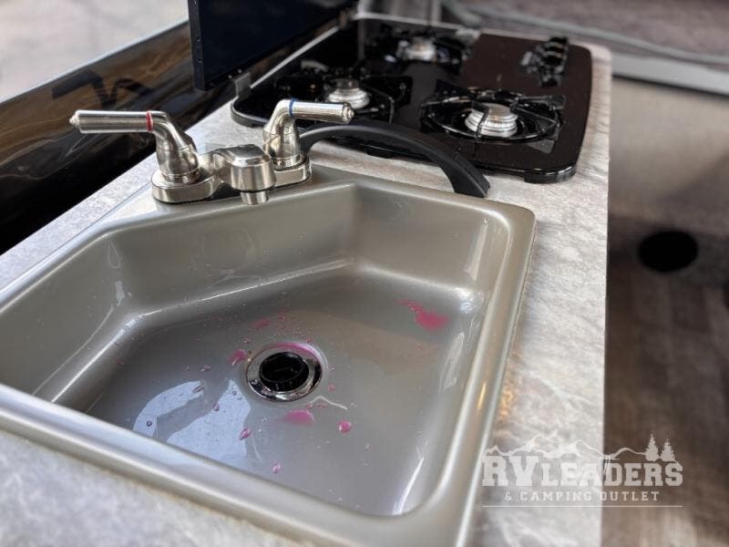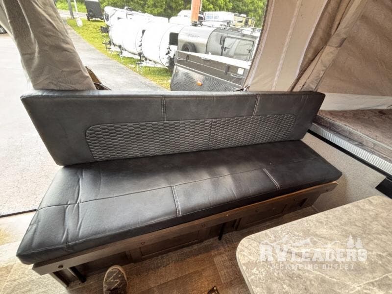 Get ready for family fun outdoors at your favorite campgrounds to enjoy hiking, fishing or whatever it is you love to do while away! This camper allows you to easily set up the two tent end beds for more interior space, dine at the booth dinette with drop leaf table, and relax on the gaucho/bed while you decide what to do next. The cook will have a swing galley to make meals including a refrigerator, and there is cabinet space to store items. And along the exterior there is a 28x84 front deck storage with expanded metal decking to carry some larger items. You might like to add the optional shower/Port-a-Pottie for convenience, and the Hot Water package with outside shower comes standard and allows you to get cleaned up before going inside. A few more highlights include residential style cabinet doors, full extension metal drawer guides, and USB charging ports.