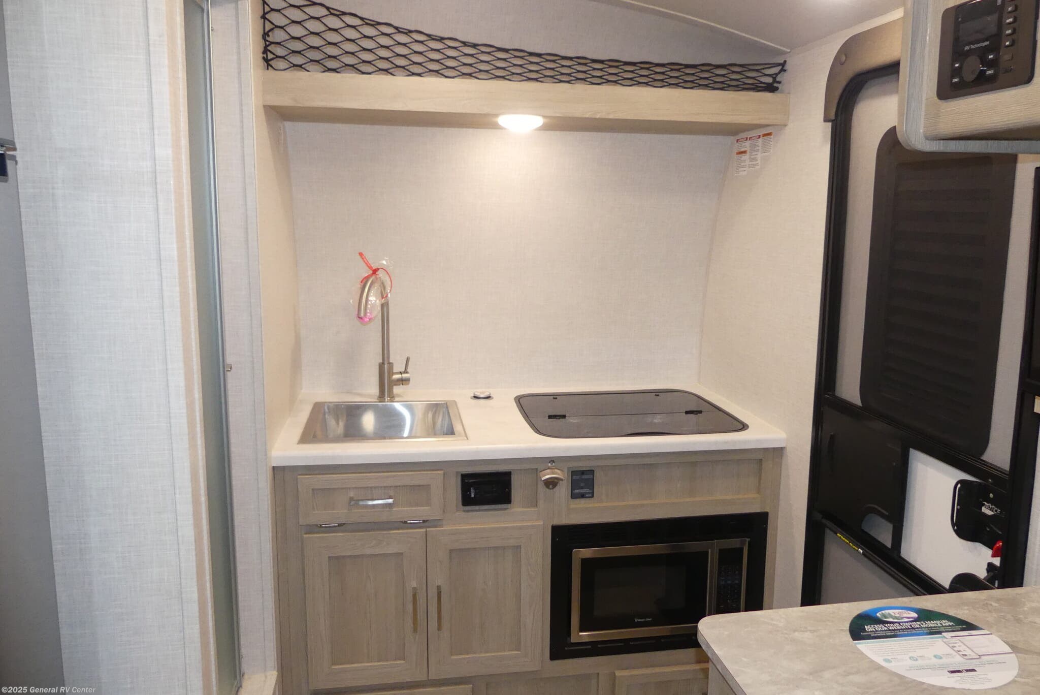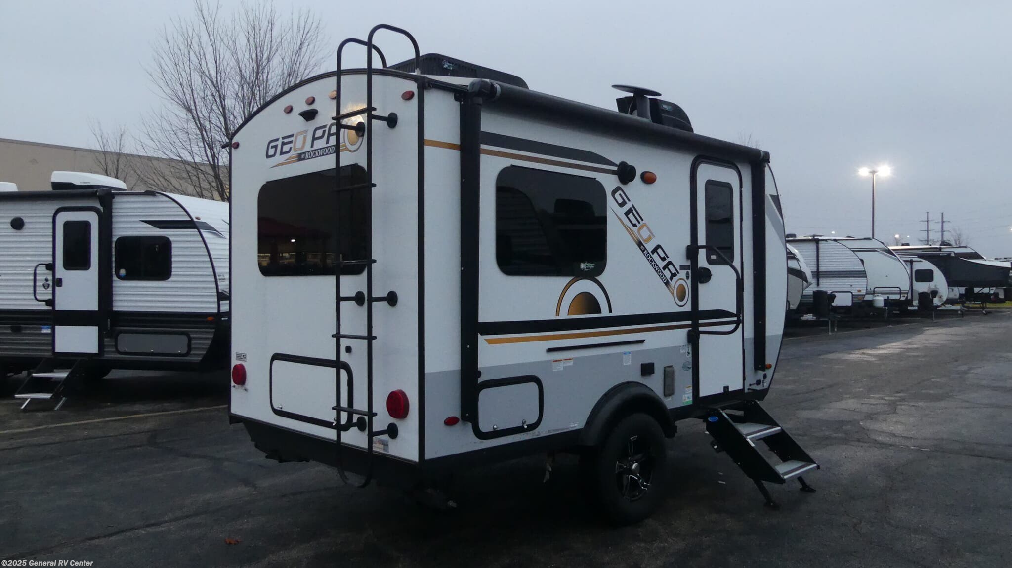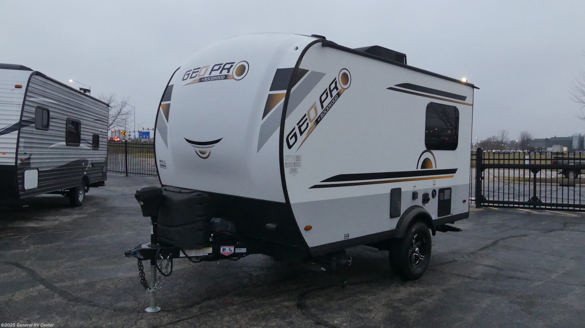 Forest River Rockwood Geo Pro travel trailer G15TB highlights: King Bed Conversion AM/FM Bluetooth Stereo Gas/Electric Refrigerator You can call this travel trailer the "Swiss Army Knife of RVs" as it is the smallest walkable unit! The rear has two 30" x 74" twin beds with a table top that can make it into one king bed. Once you have washed up in the full bathroom, you can whip up a delicious breakfast with the cooktop. You can even pop a frozen breakfast sandwich into the microwave if you're in a hurry that day. The exterior has a 10' power awning and exterior storage areas so you can bring along all of your camping gear! Each one of these Forest River Rockwood Geo Pro toy haulers are ready to go where ever your adventure takes you! With a solid construction consisting of a torsion axle, Rubber-Ryde suspension, a six-sided aluminum frame, and 5/8" residential tongue and groove plywood flooring, you can be sure to get years of use. You will appreciate the magnetic baggage door catches to store all your gear, and the frame mounted stabilizer jacks make setting up easier than ever. Each model includes a 12V TV with a DVD player and an AM/FM stereo with Bluetooth and USB ports to keep you entertained.