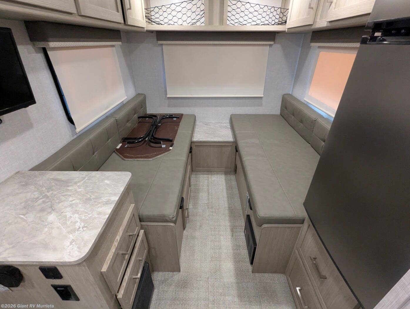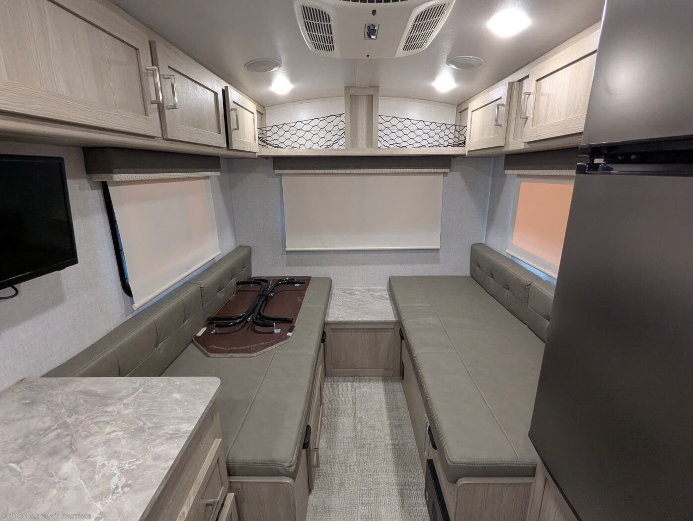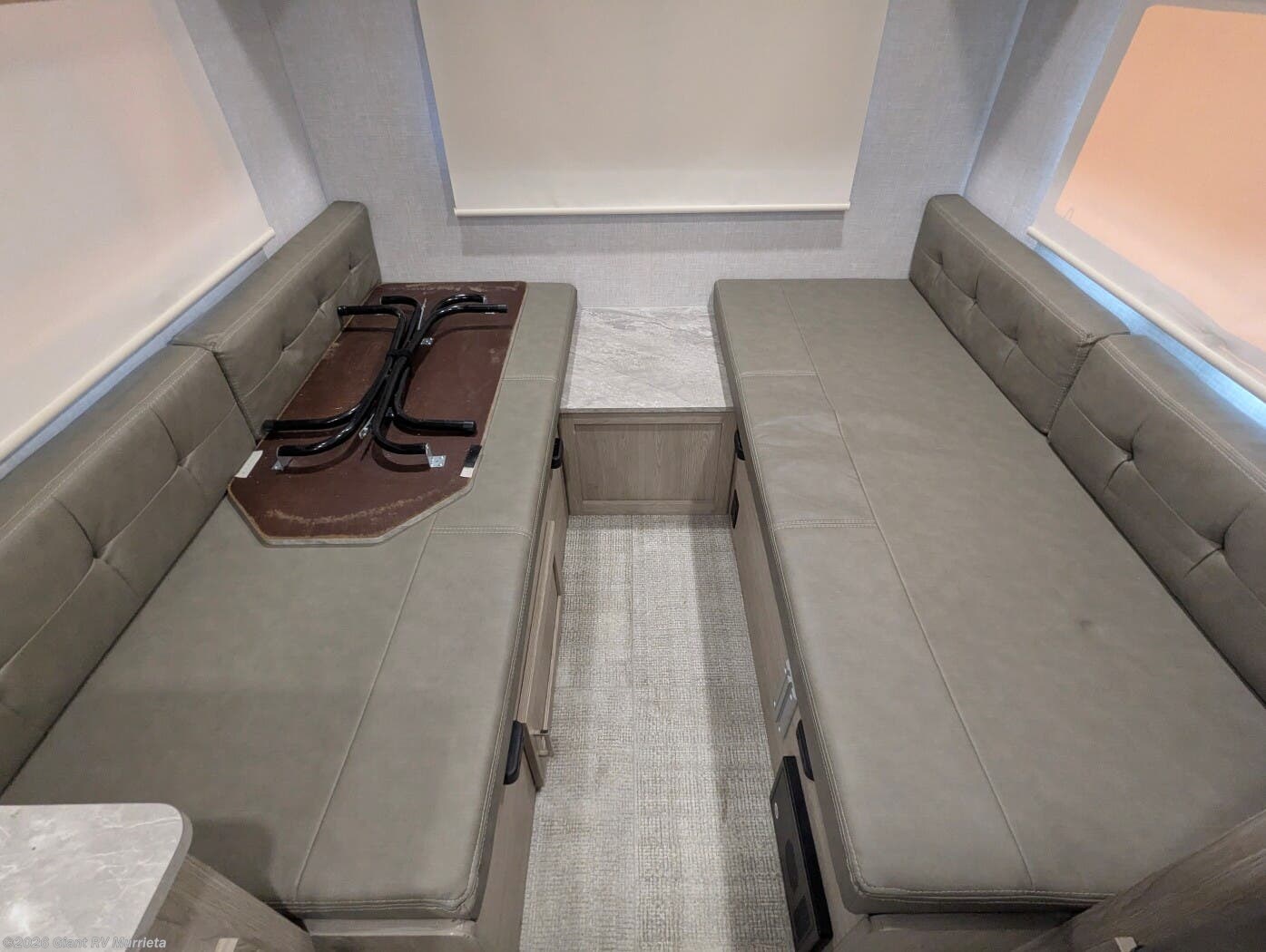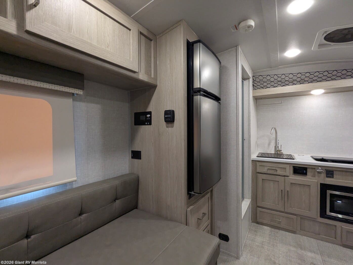 - Modern Kitchen: Compact kitchen with a 3.5 cu. ft. 12V refrigerator, 2-burner cooktop, and convection microwave for meal prep.