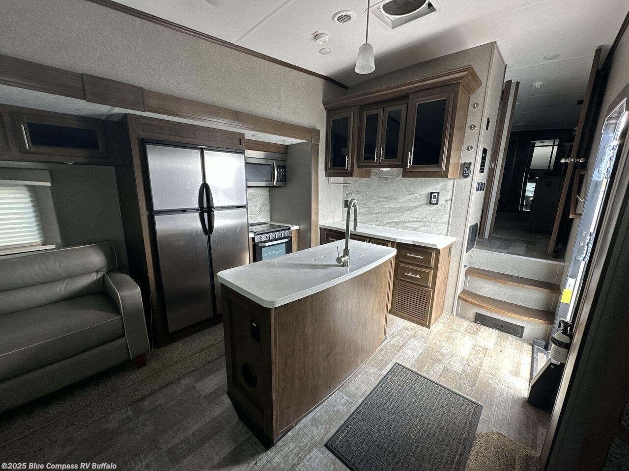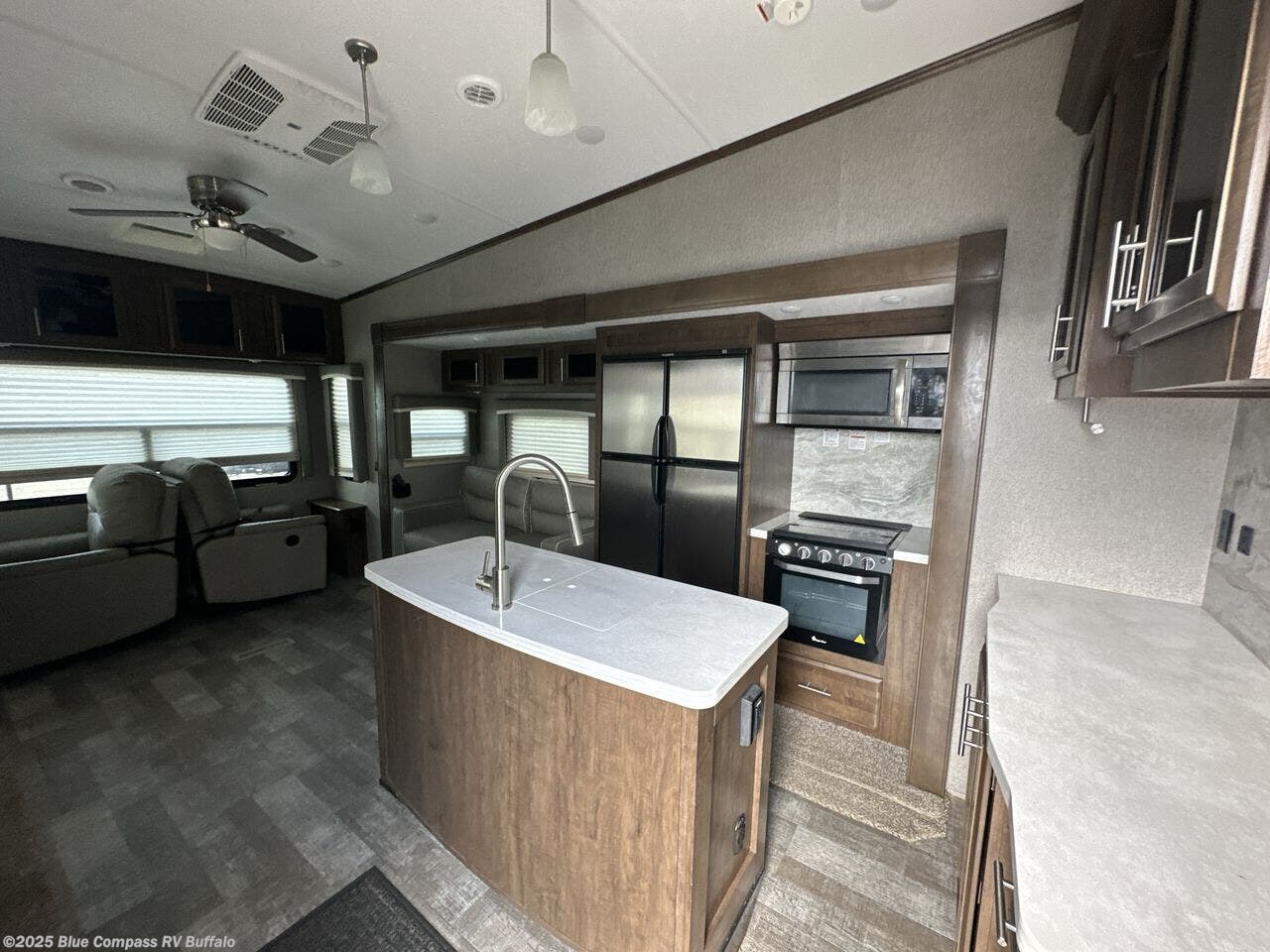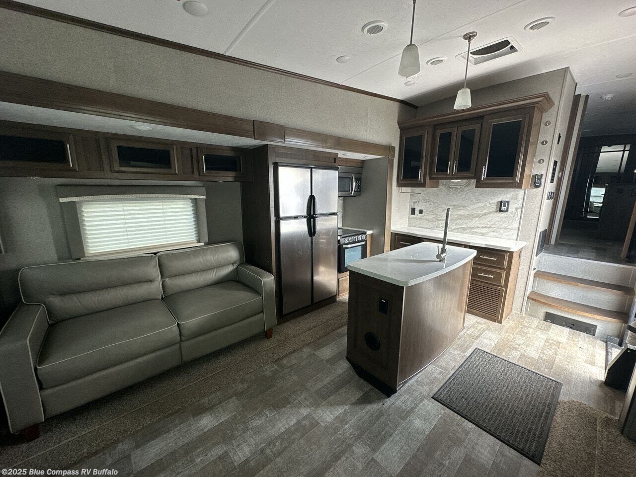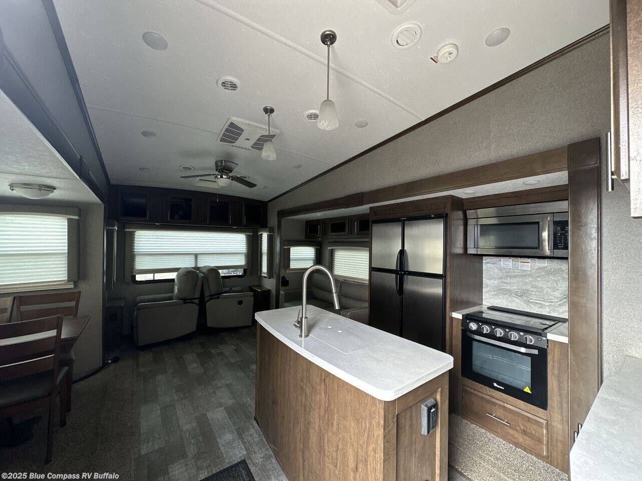 Load up all your gear in the pass-through storage and additional exterior storage then head to the campground in this fifth wheel! Once you arrive at your destination, put out the two power awnings and enjoy some fresh air before heading inside to make lunch. The chef of your group will have a three burner range and a microwave oven to prepare a meal, and there is ample counter space plus a kitchen island to set out paper plates and drinks. Your guests will find comfortable seating spaces on the hide-a-bed sofa, the dual recliners, and the table and chairs. This model also includes a dual entry bath that will create a front master bedroom you are sure to love. There is a king bed slide out, a wardrobe and a shirt closet, plus a space that has been prepped to add an optional washer and dryer!