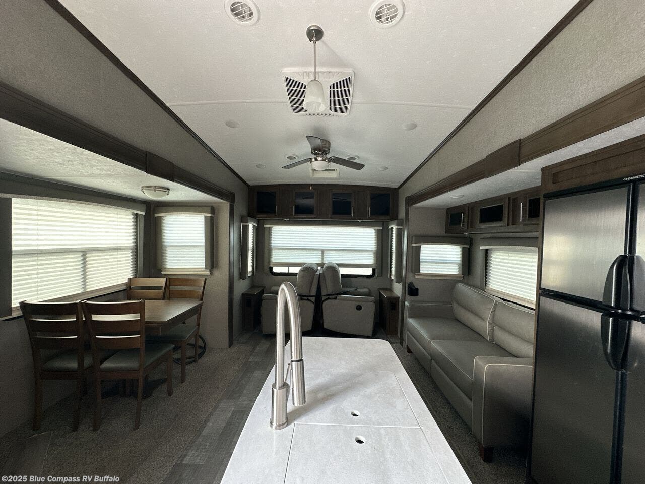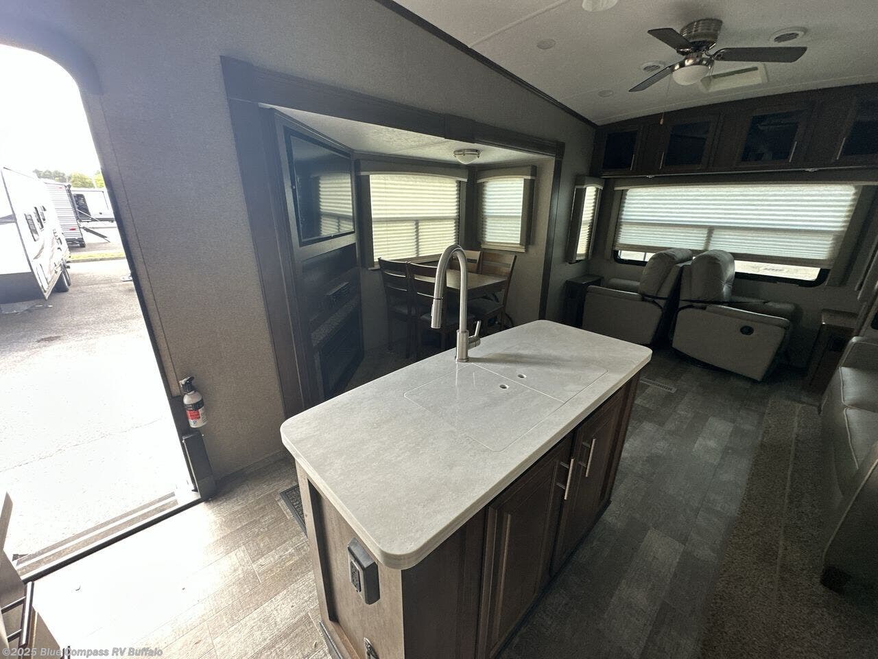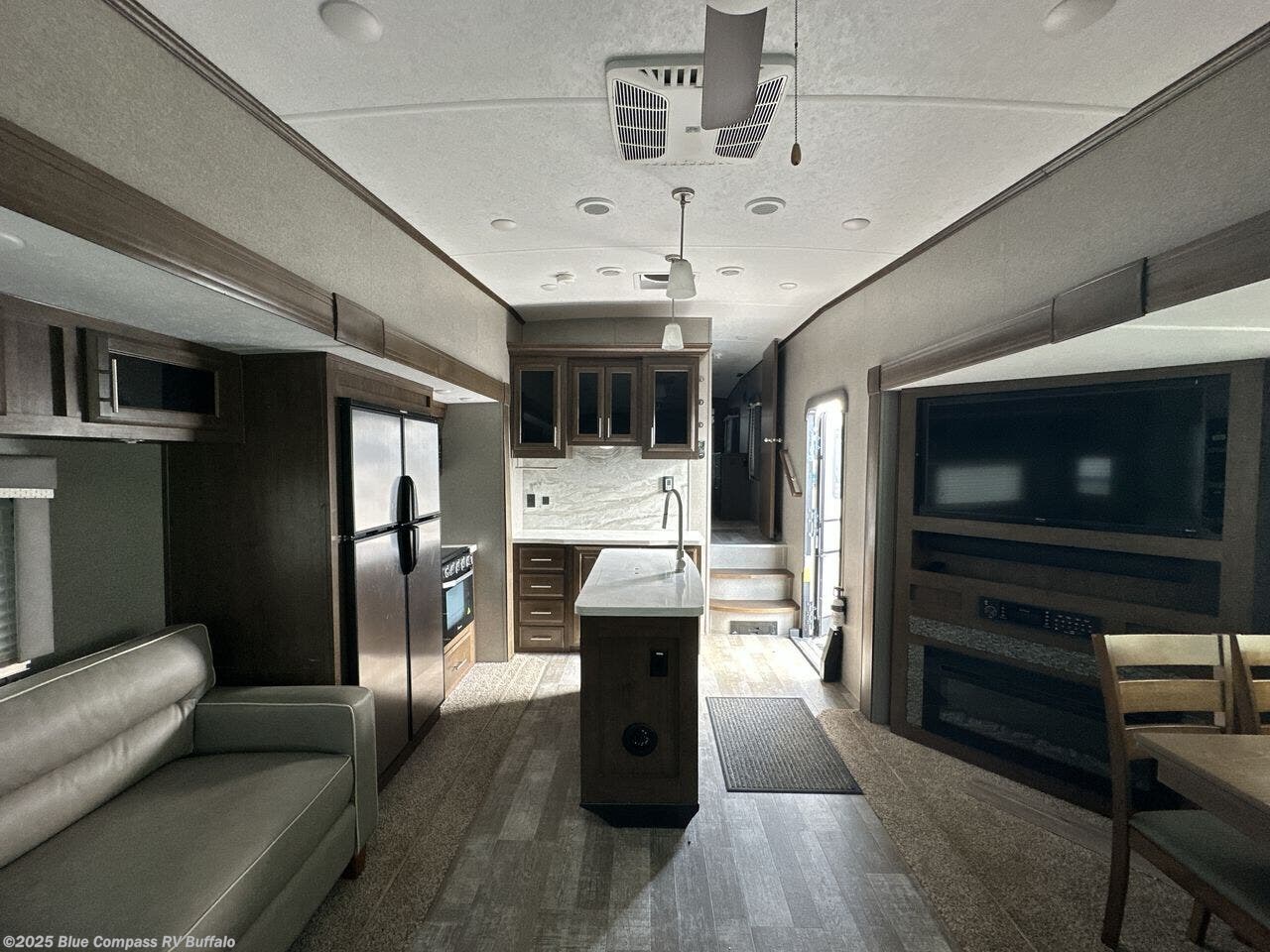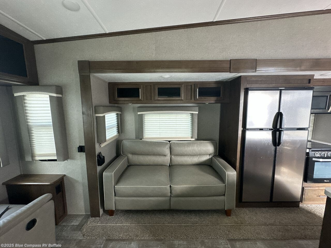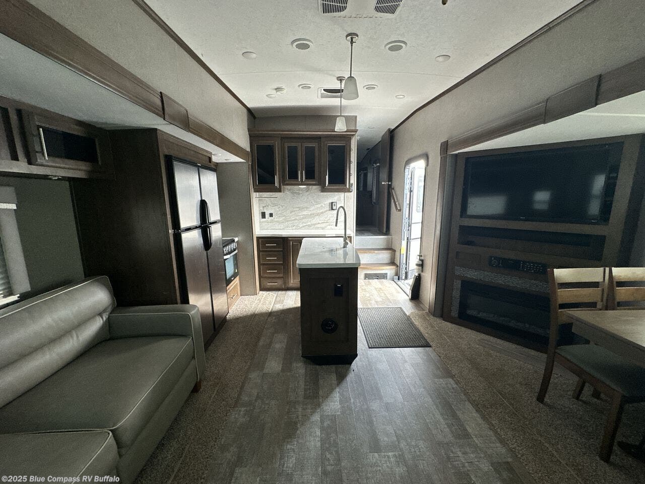 Load up all your gear in the pass-through storage and additional exterior storage then head to the campground in this fifth wheel! Once you arrive at your destination, put out the two power awnings and enjoy some fresh air before heading inside to make lunch. The chef of your group will have a three burner range and a microwave oven to prepare a meal, and there is ample counter space plus a kitchen island to set out paper plates and drinks. Your guests will find comfortable seating spaces on the hide-a-bed sofa, the dual recliners, and the table and chairs. This model also includes a dual entry bath that will create a front master bedroom you are sure to love. There is a king bed slide out, a wardrobe and a shirt closet, plus a space that has been prepped to add an optional washer and dryer!
