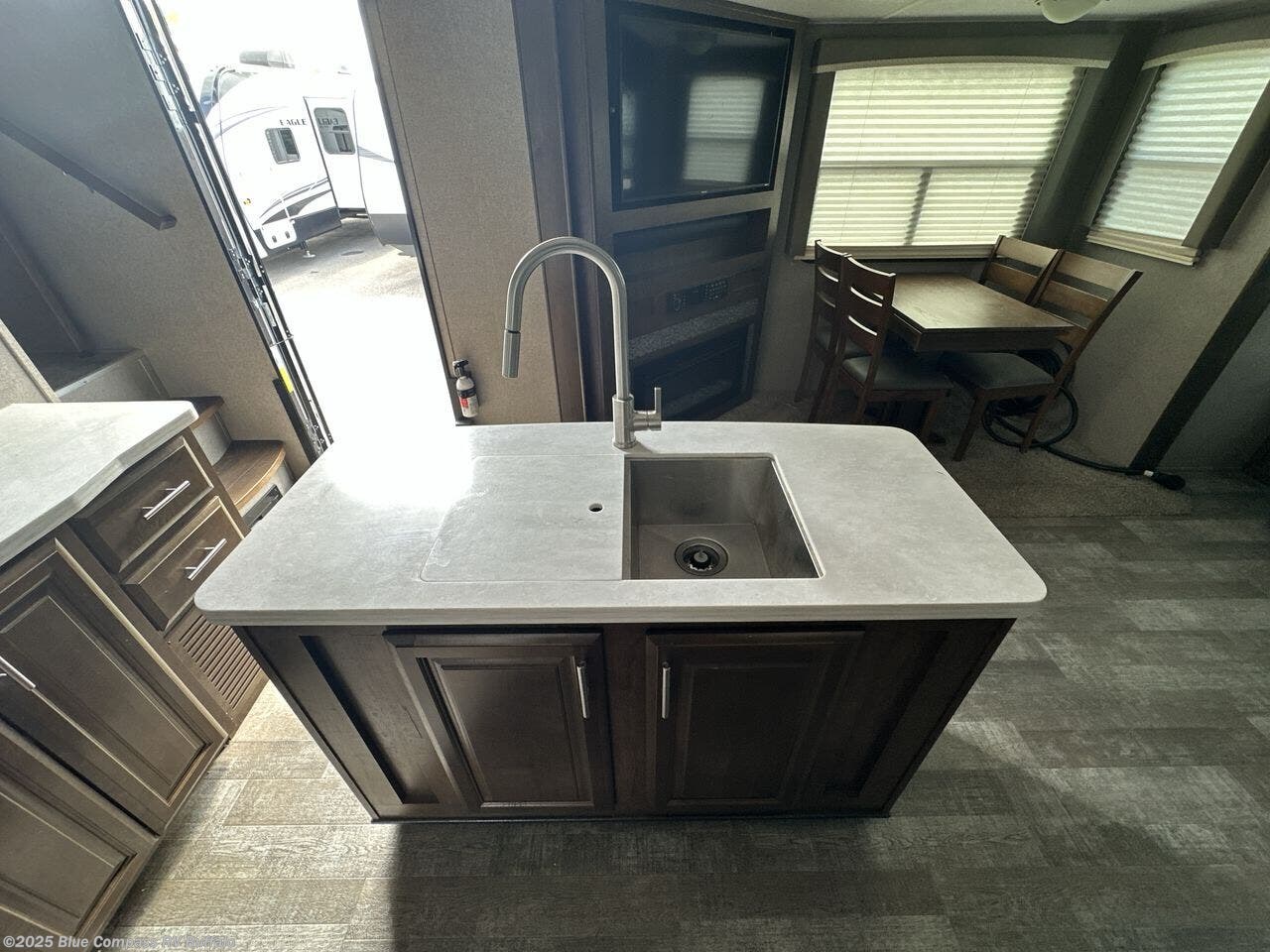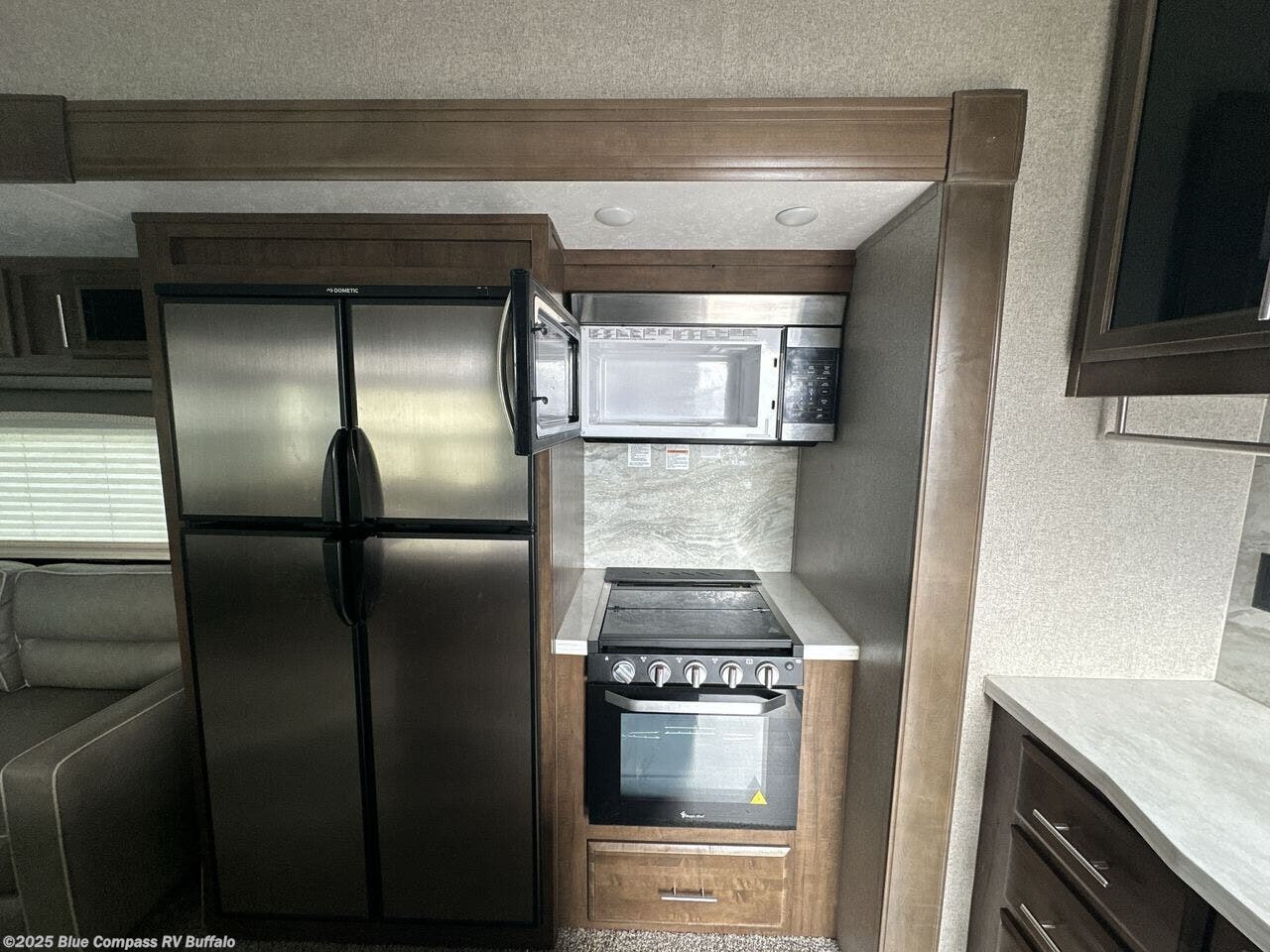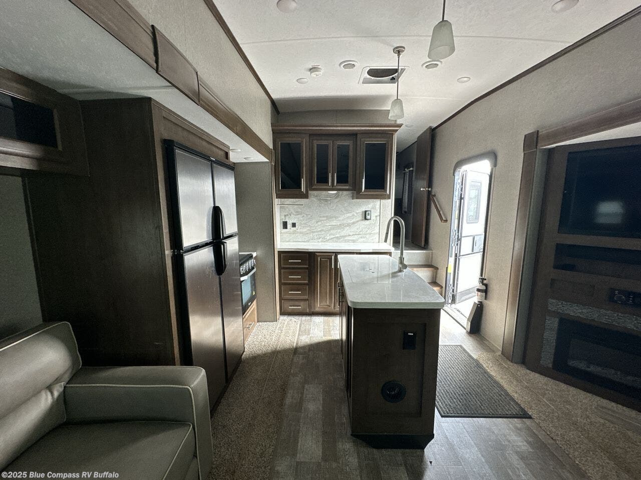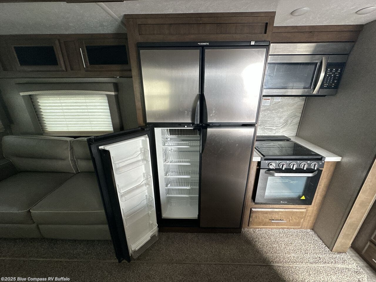 Load up all your gear in the pass-through storage and additional exterior storage then head to the campground in this fifth wheel! Once you arrive at your destination, put out the two power awnings and enjoy some fresh air before heading inside to make lunch. The chef of your group will have a three burner range and a microwave oven to prepare a meal, and there is ample counter space plus a kitchen island to set out paper plates and drinks. Your guests will find comfortable seating spaces on the hide-a-bed sofa, the dual recliners, and the table and chairs. This model also includes a dual entry bath that will create a front master bedroom you are sure to love. There is a king bed slide out, a wardrobe and a shirt closet, plus a space that has been prepped to add an optional washer and dryer!