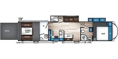 With a 13' garage and a 30-gallon external fueling station, you'll be able to take just about any camping toy along for the adventure in this 2021 Vengeance Rouge Armored 37A13 fifth wheel toy hauler.