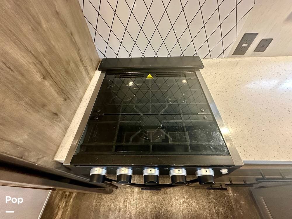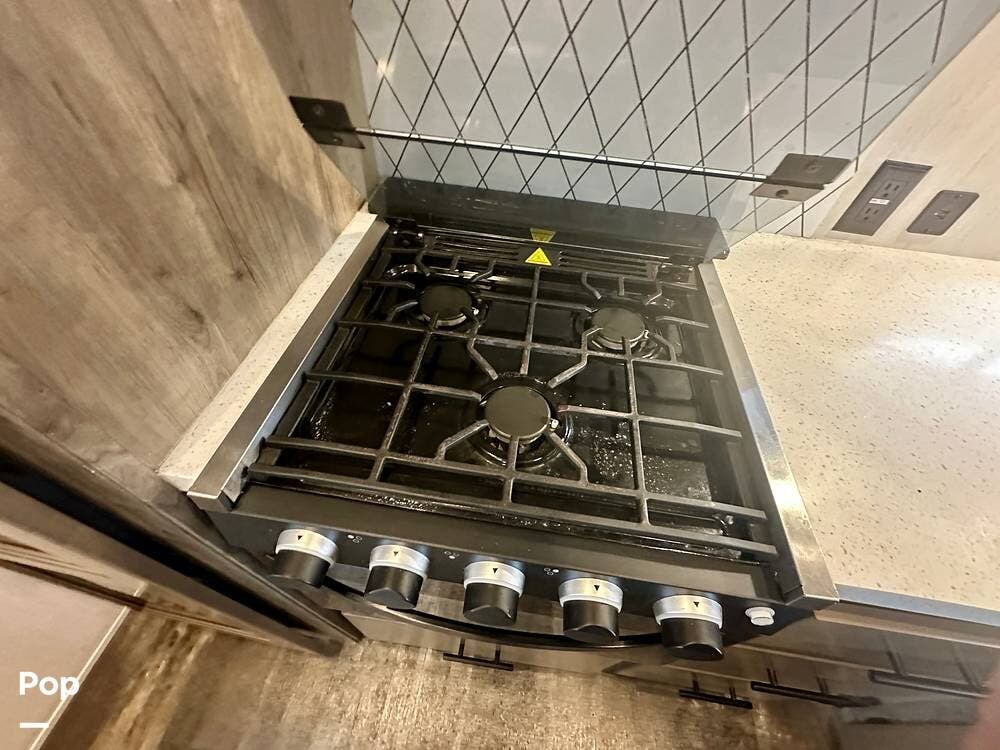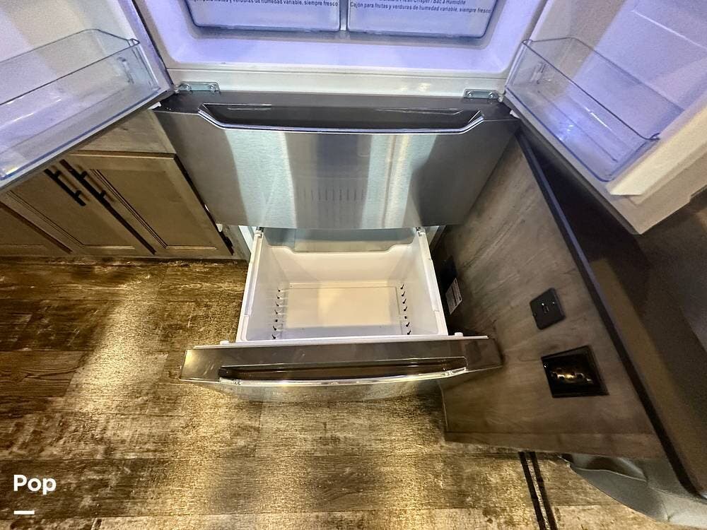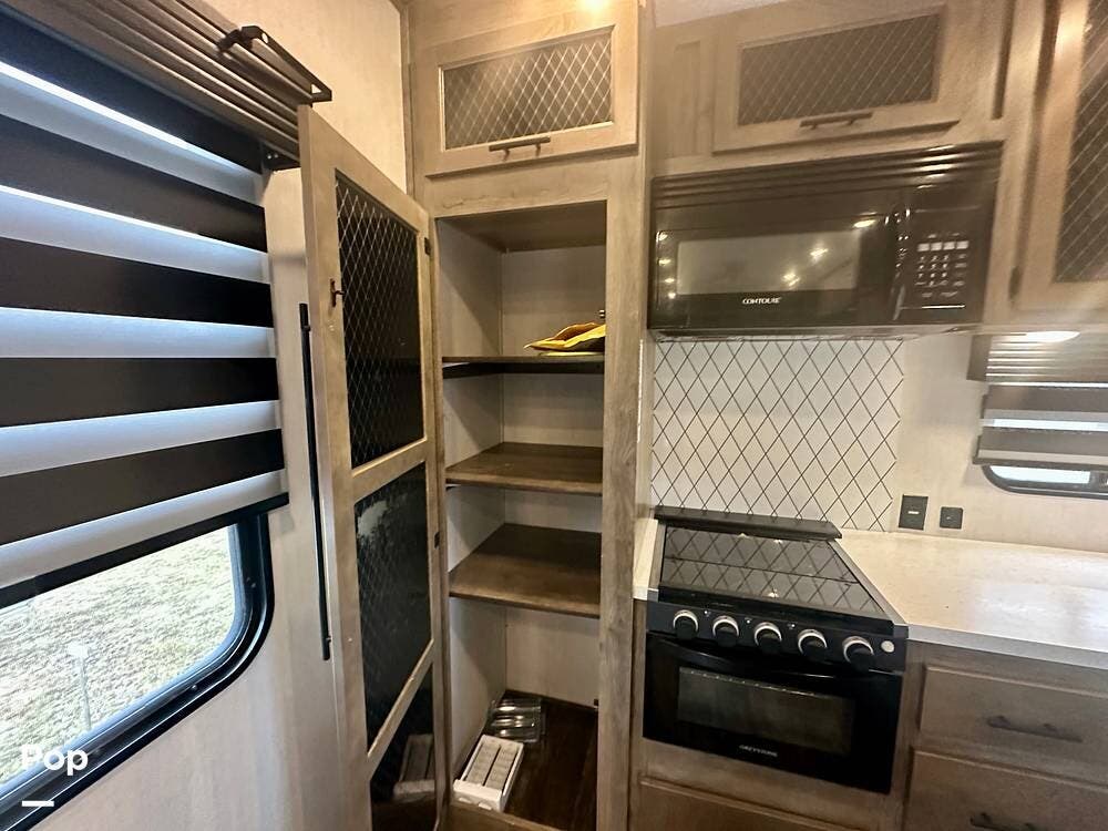 The kitchen is designed for those who enjoy cooking, even when away from home. A residential refrigerator, gas range, microwave, and deep farmhouse sink make meal prep simple, while solid-surface countertops and abundant cabinetry provide both style and function. The pantry is large enough for all your cooking essentials. The adjacent dining area offers space for family meals or morning coffee with a view through the panoramic windows. Next to the dining table, there is a desk perfect for nomads.