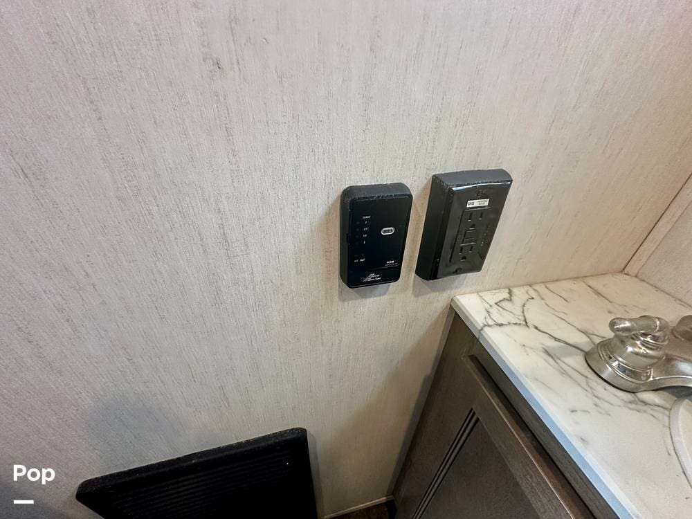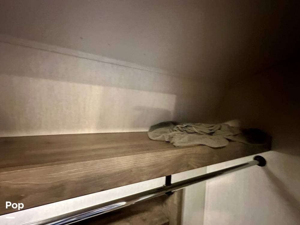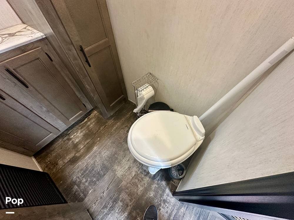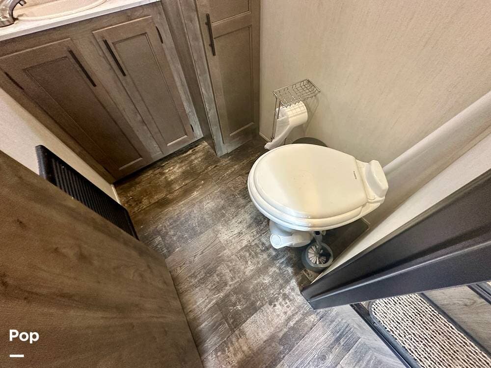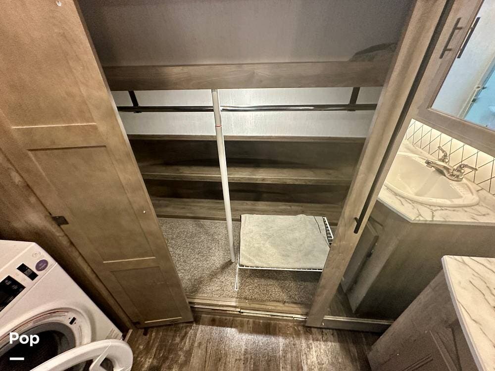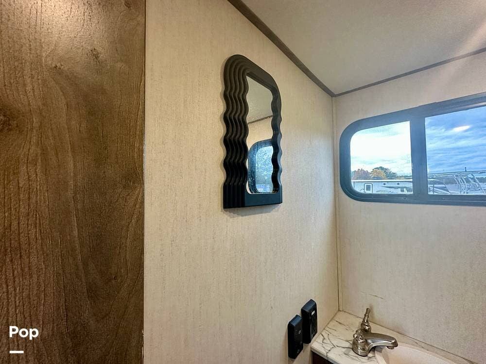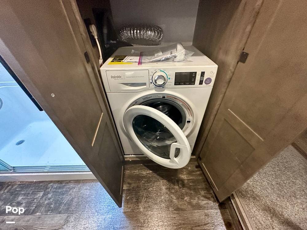 The master suite feels like a private retreat, featuring a queen-size bed, ample wardrobe space, and its own entertainment setup. The real showpiece, though, is the front bath--a spacious, elegant bathroom with dual vanities, a large shower, a washer/dryer combo, and exceptional storage, along with the rare convenience of a half bath just off the main living area.