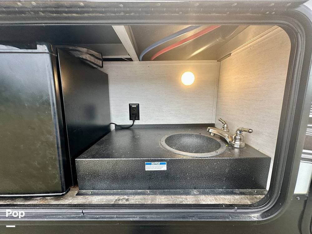 Outside, the Sabre continues to impress with power awnings, exterior speakers, LED lighting, and generous basement storage for all your gear. An outdoor fridge and sink for extra convenience. The durable construction, smooth towing design, and automatic leveling system make setup easy, letting you spend less time adjusting and more time relaxing.