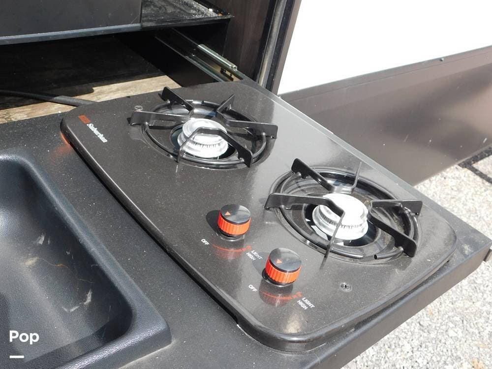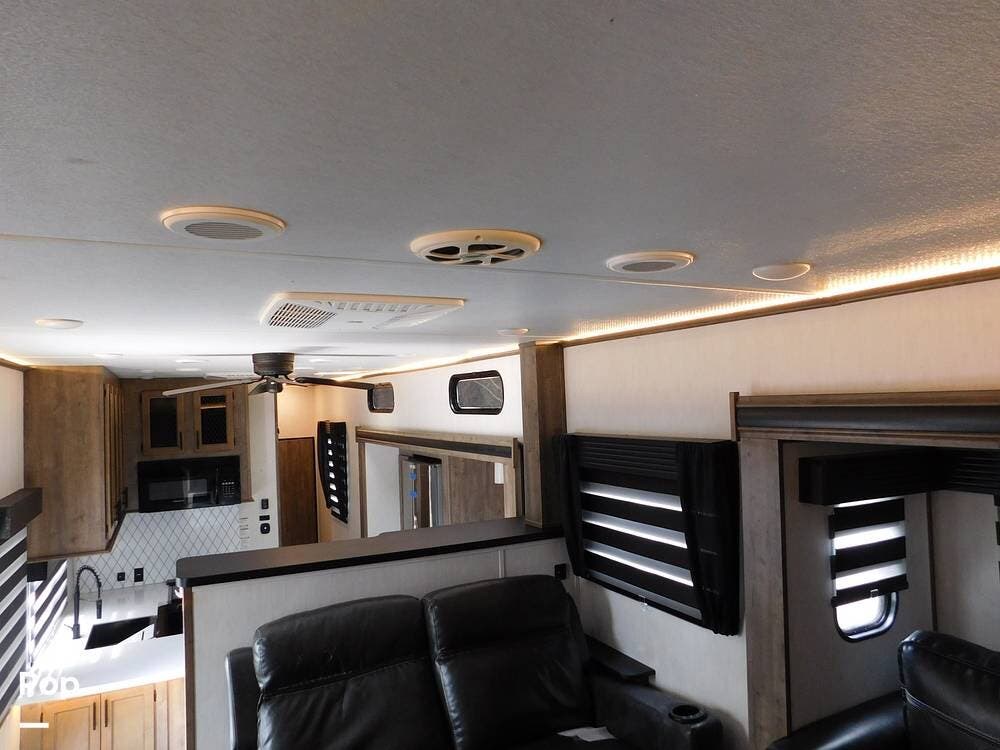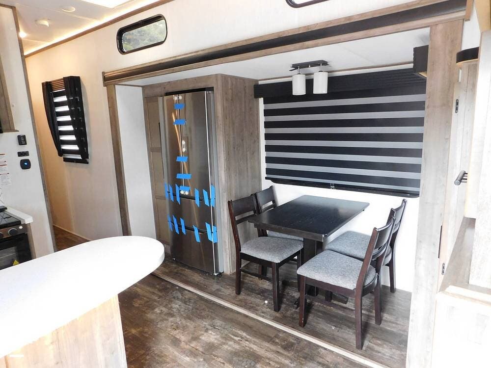One of the standout features of the Forest River Sabre is its exterior design, which features sleek lines, modern graphics, and ample storage space for all your gear. The large awning provides shade on sunny days, and the outdoor kitchen allows you to cook and dine al fresco. Two ACs on the roof to keep you comfy and solar to keep batteries charged.
