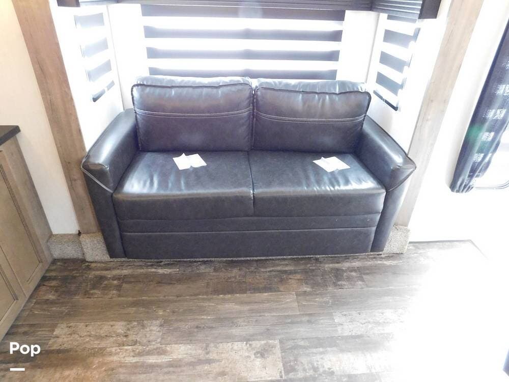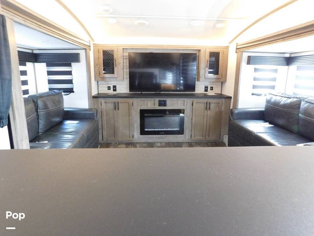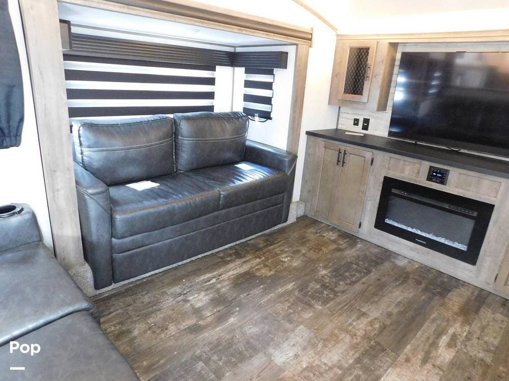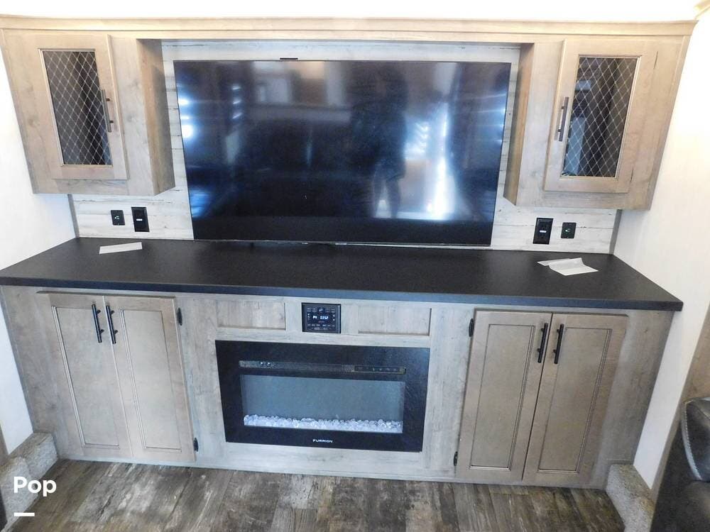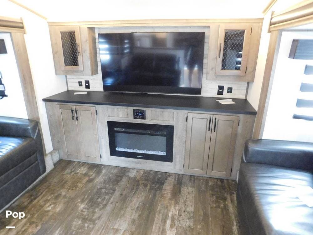 Inside, the Sabre features a modern and stylish interior with ample space for relaxation and entertainment. The living area is equipped with comfortable seating, a large TV, and a fireplace for cozy evenings. Living area has two convertible sofas and a loveseat recliner.
