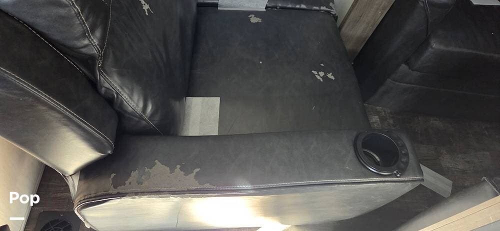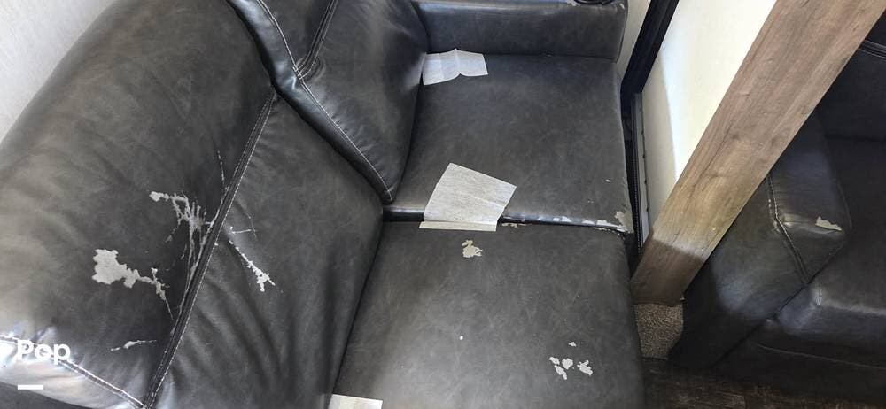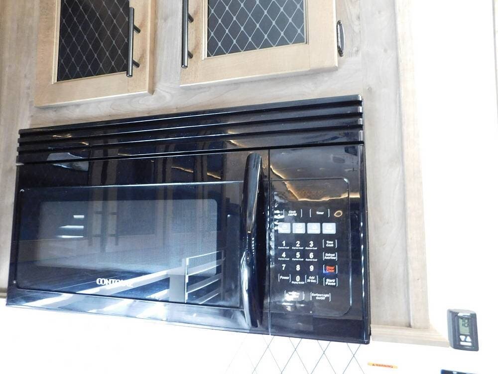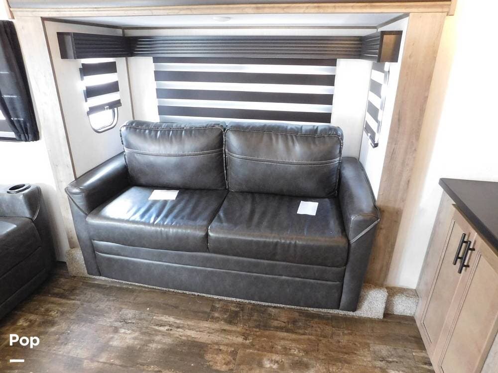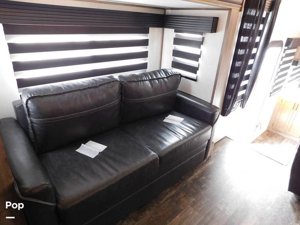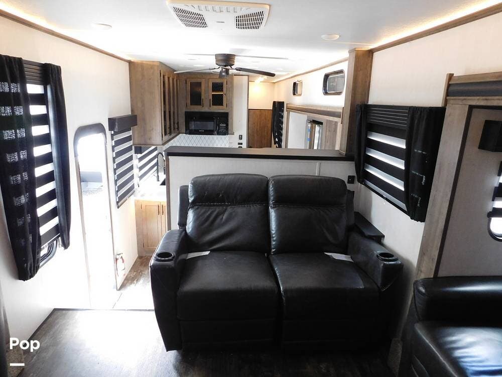 Inside, the Sabre features a modern and stylish interior with ample space for relaxation and entertainment. The living area is equipped with comfortable seating, a large TV, and a fireplace for cozy evenings. Living area has two convertible sofas and a loveseat recliner.