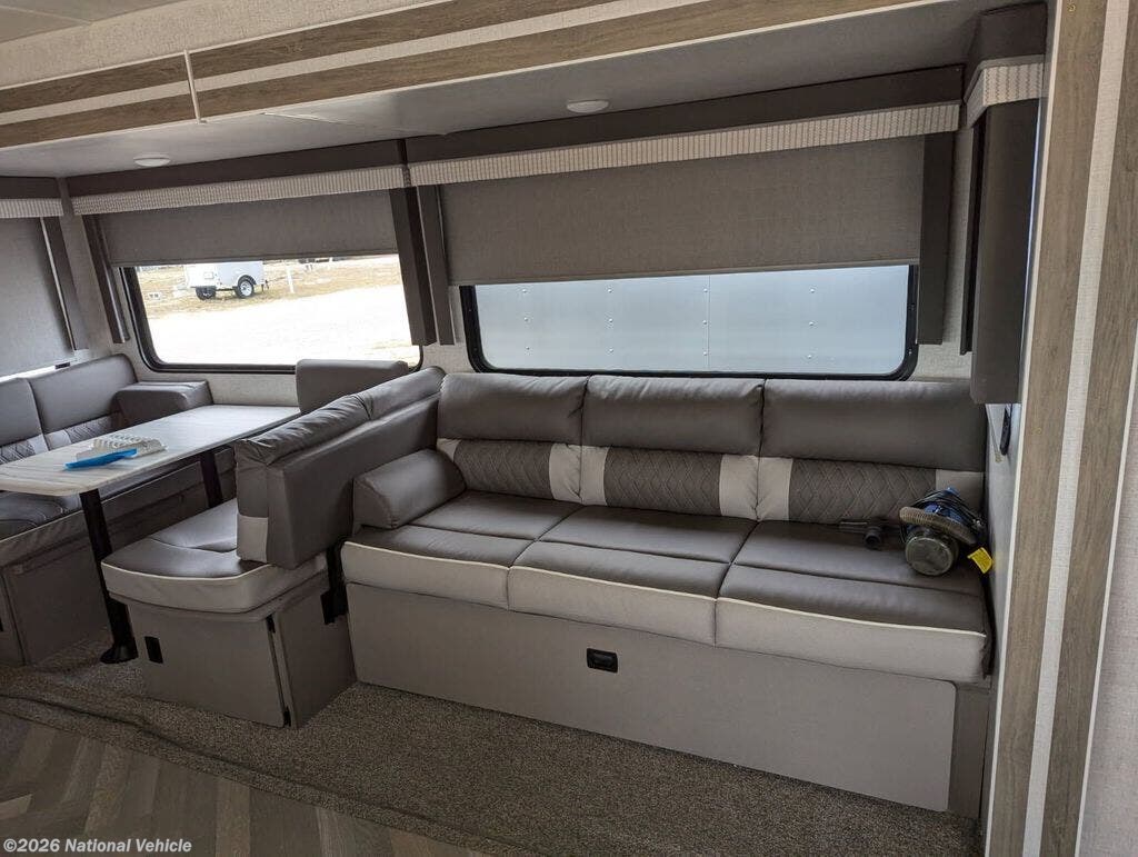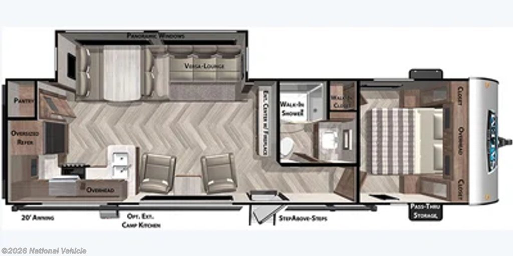 With a spacious kitchen and panoramic windows, this travel trailer is sure to stand out! The Versa Lounge is customizable for you to reconfigure for your needs and it also has Stow N Go storage for extra blankets. Your nights will be spent in true comfort by playing games at the booth dinette or relaxing in one of the two chairs by the fireplace. You can either cook a delicious meal in the rear kitchen or you can enjoy the exterior camp kitchen to breathe in some fresh air while you cook. After a fun-filled day, you can rinse off in the walk-in shower then head to the front private bedroom, grab your pajamas from the walk-in closet, and lay down on the Evergreen mattress for a good night's rest!