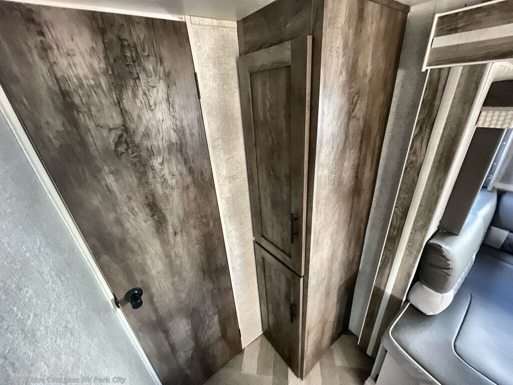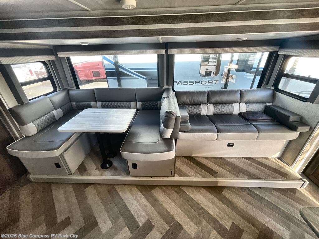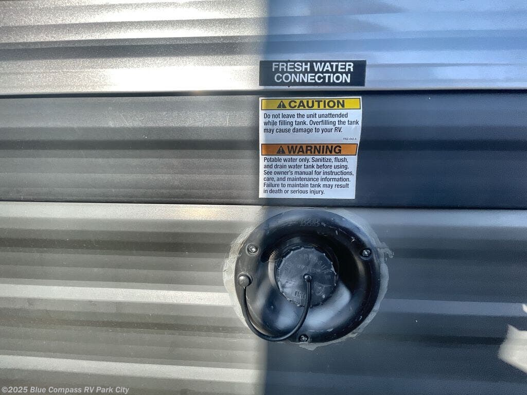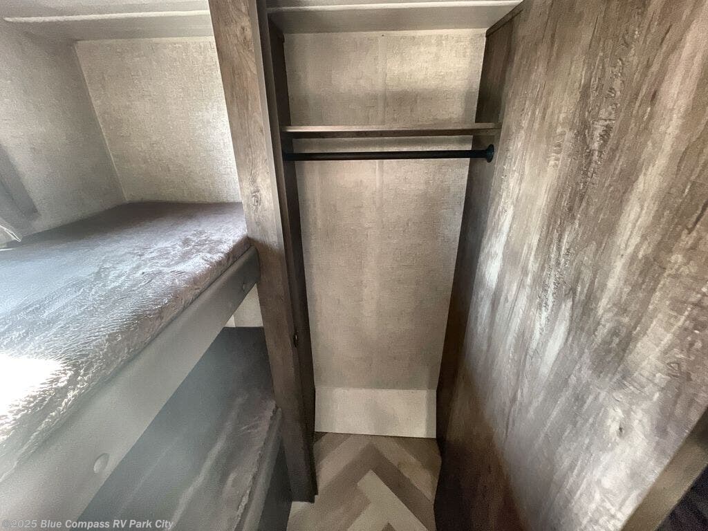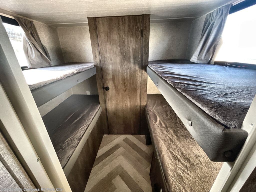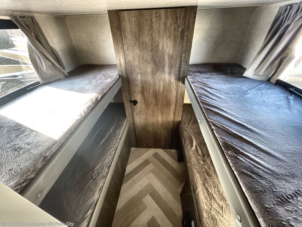 The hardest decision you will have to make with this travel trailer is where to take it! You will feel right at home sleeping in the front private bedroom with closets on either side of the queen bed. The kids will have their own privacy with the rear bunkhouse that has two sets of 30" x 74" bunk beds and a closet to store their items. You can prepare delicious home cooked meals with the three burner cooktop then enjoy them at the U-shaped dinette, and if there happens to be any leftovers then you can store them in the oversized 11 cu. ft. refrigerator. The Versa-lounge is great for taking an afternoon nap or sitting by the fireplace at night. If you choose to add the optional exterior camp kitchen then you can have breakfast outside and stay protected by the 16' power awning!