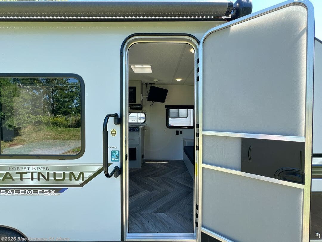 You will experience an easy-to-tow, lightweight, fully featured toy hauler or travel trailer with a Forest River Salem FSX! Each model is perfect for a first-time camper or an experienced one, and they offer a modern residential living space for a home-away-from-home experience. The Tuffcoat scratch-resistant exterior paint and diamond plate front rock guard will not only turn heads down the road, but also protect your unit for years to come. New to 2021 is Herringbone ultra-durable Congoleum floors that are easy to clean, AccessiBelly enclosed underbelly panels to better protect your unit from the elements, an additional 5.5 sq. ft. of countertop space, and a dual group 24 battery tray. These Platinum Edition models come with a fiberglass exterior with chrome wheel caps and lug nuts, and they add approximately 150 pounds of dry weight for single axels and 300 pounds for toy haulers. Come see what model suits you best today!
