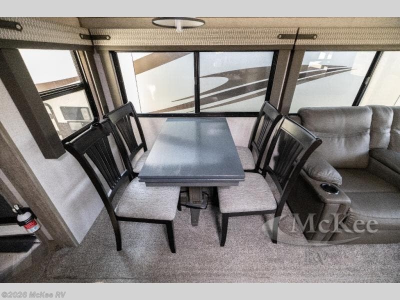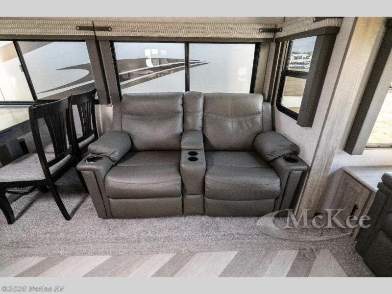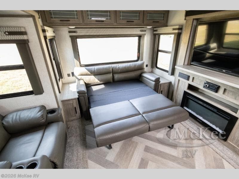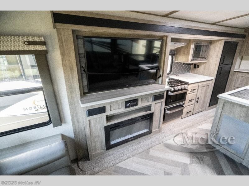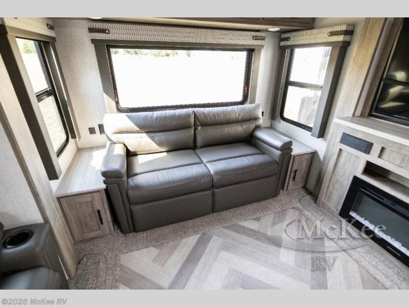 Step inside this luxurious travel trailer and see all that it has to offer! You will enjoy a good night's rest each night on the queen bed with wardrobes on either side to keep your hanging clothes wrinkle free, and if you have a couple of guests then you can convert the rear tri-fold sofa or the booth dinette into a sleeping space. The 30" x 36" walk-in shower with a skylight above invites you to take a hot, steamy shower after a fun-filled day outdoors. Once you're cleaned up, you can grab some leftovers from the 10.7 cu. ft. residential refrigerator and warm it up in the microwave then head to the theatre seating and watch your favorite movie on the 50" LED TV with a 32" glass front electric fireplace below!