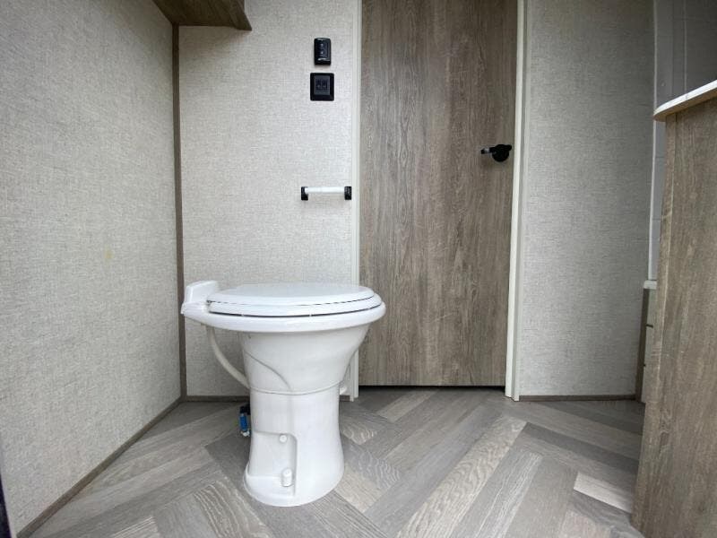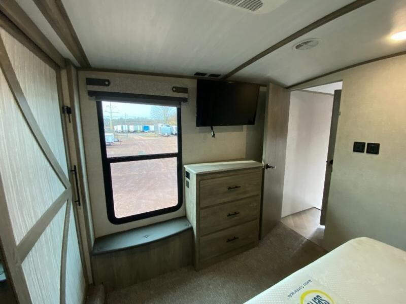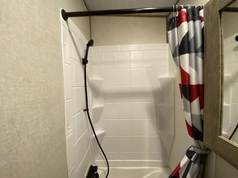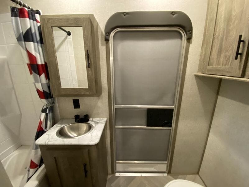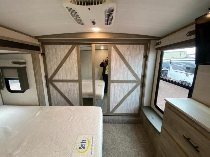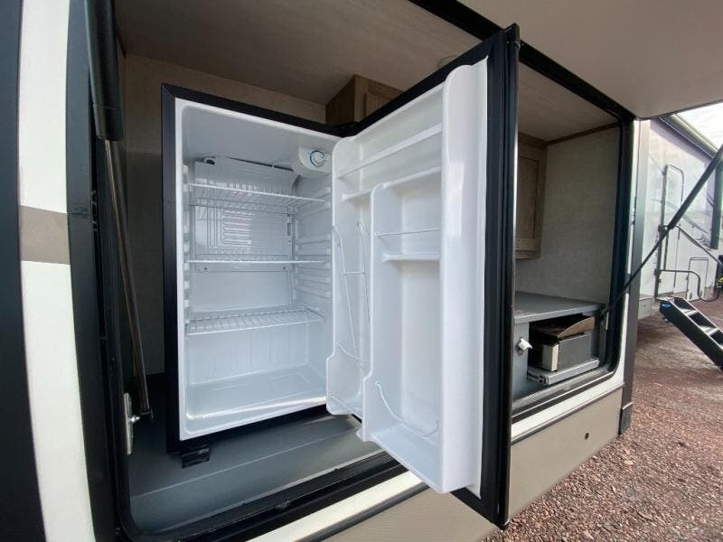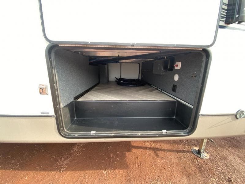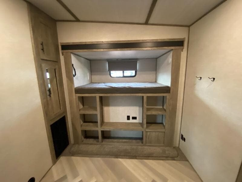 With two full bathrooms, everyone will stay clean in this fifth wheel! The double entry doors makes for a smooth flow of traffic and the unique rear entrance leads directly into the rear full bathroom. The private bunkhouse features not only one bunk above a Versa queen convertible bed/sofa, but also a second bunk above with storage. The U-shaped dinette is the perfect place for you to enjoy your meals at, play some card games and even transform into an extra sleeping space. There is also a bench next to the main entrance so you can conveniently sit down to take your shoes off. The exterior has plenty of features you will love too like the outside kitchen/bar so you can have a good time cooking outdoors and a coax/TV hookup that you can add your own outside TV, plus an extra large pass-through storage area for your outdoor gear!