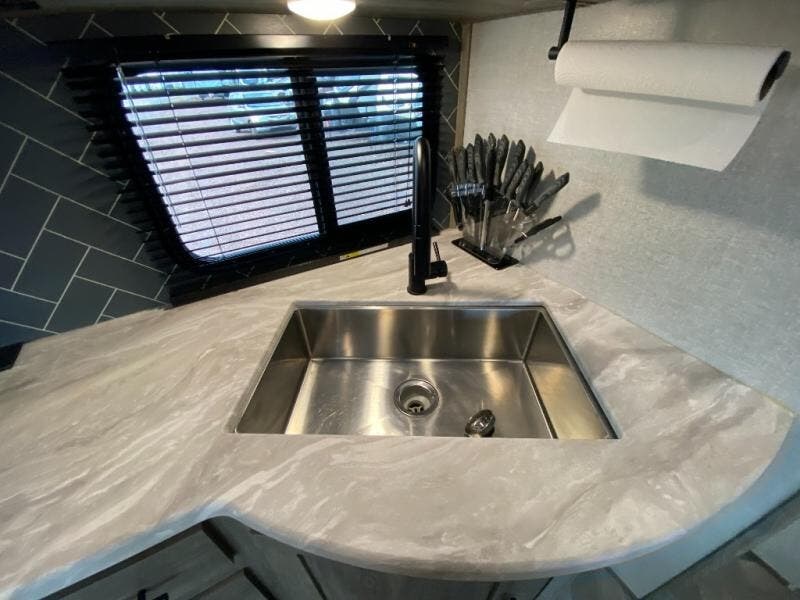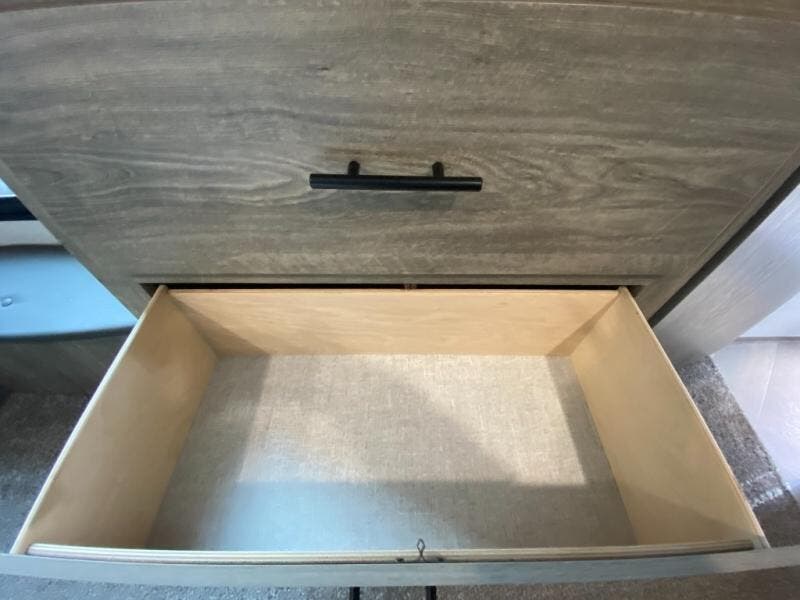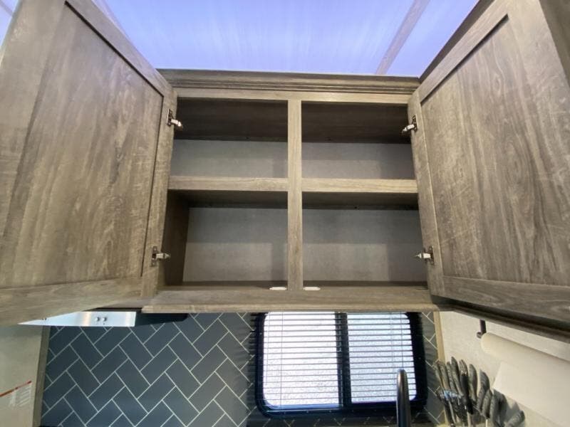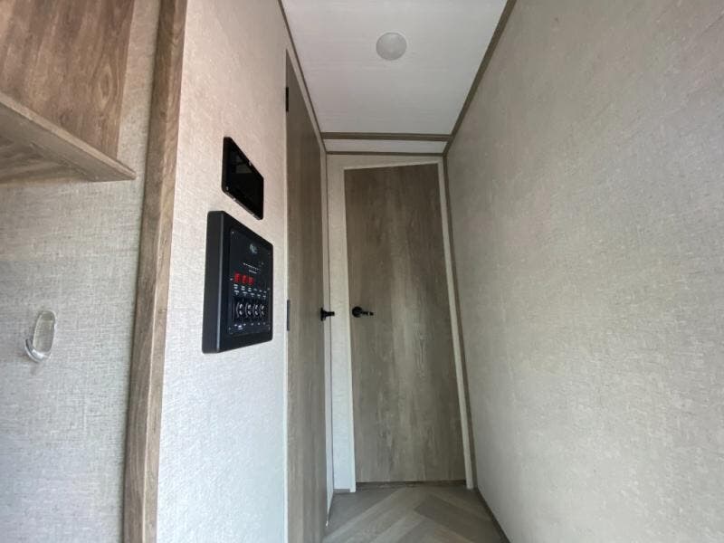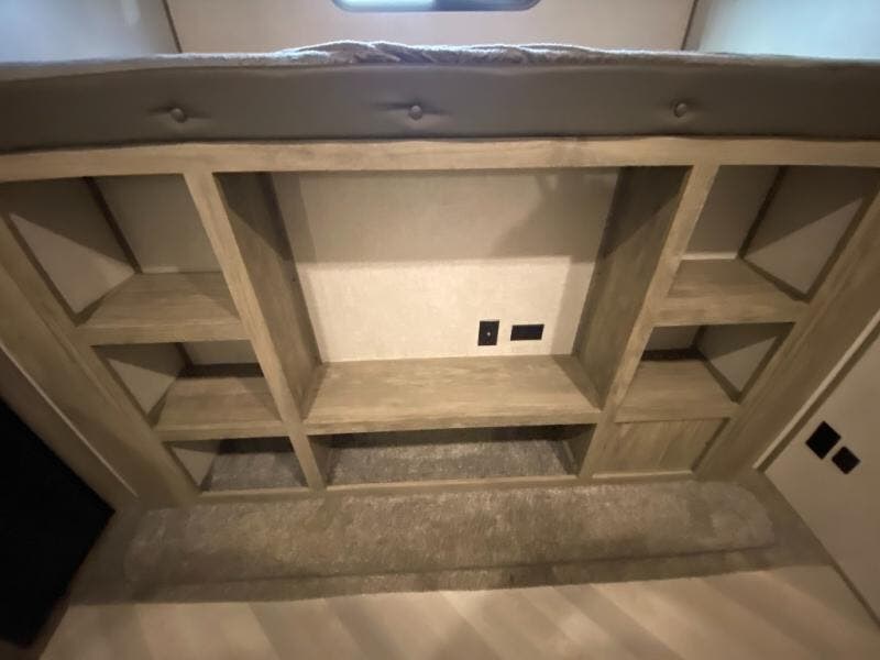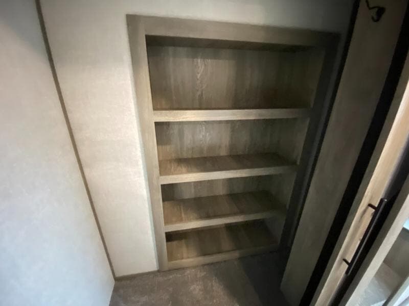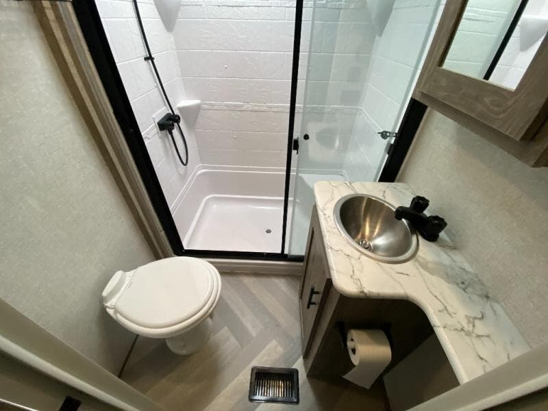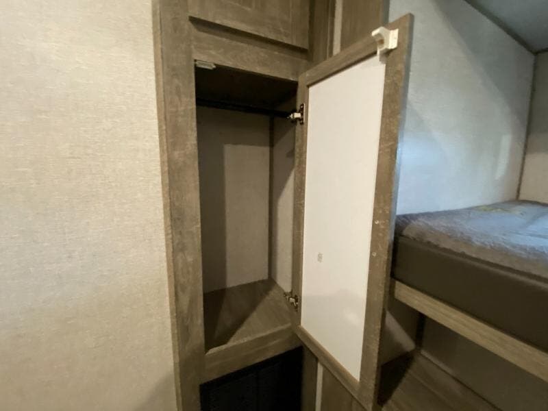 With two full bathrooms, everyone will stay clean in this fifth wheel! The double entry doors makes for a smooth flow of traffic and the unique rear entrance leads directly into the rear full bathroom. The private bunkhouse features not only one bunk above a Versa queen convertible bed/sofa, but also a second bunk above with storage. The U-shaped dinette is the perfect place for you to enjoy your meals at, play some card games and even transform into an extra sleeping space. There is also a bench next to the main entrance so you can conveniently sit down to take your shoes off. The exterior has plenty of features you will love too like the outside kitchen/bar so you can have a good time cooking outdoors and a coax/TV hookup that you can add your own outside TV, plus an extra large pass-through storage area for your outdoor gear!