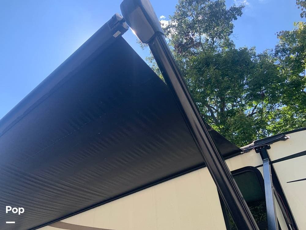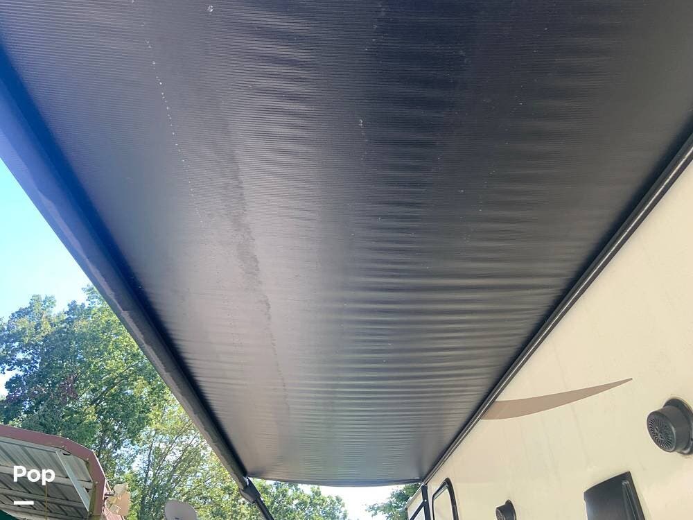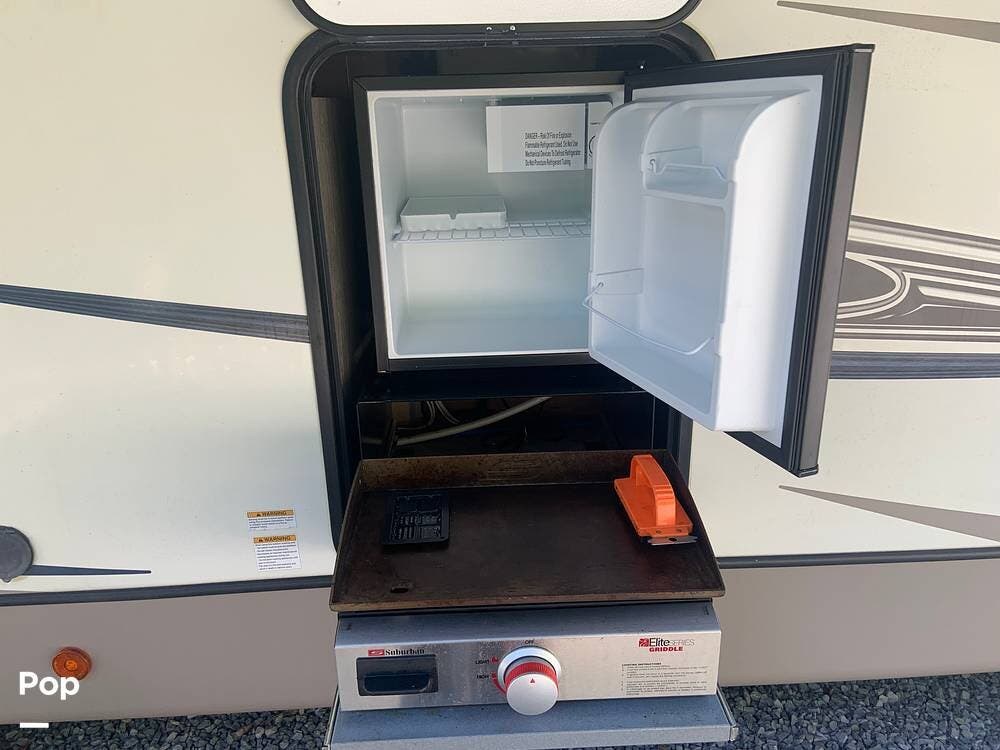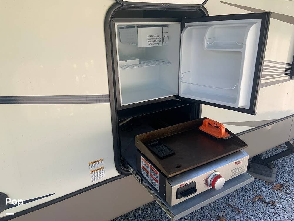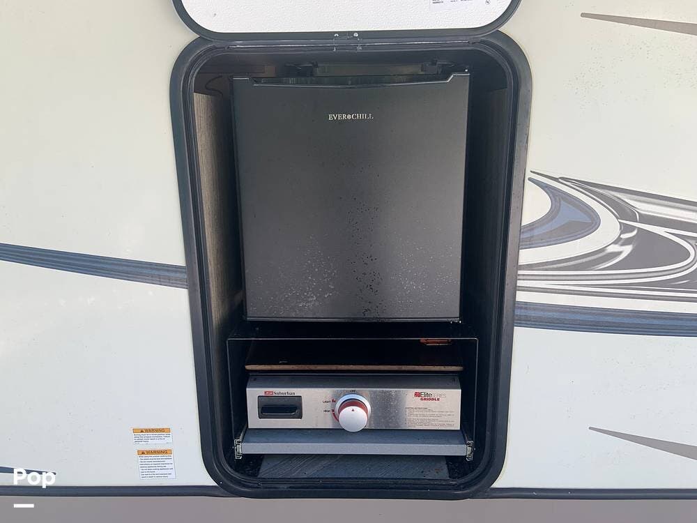 Outside, you are covered by a full 18-foot patio awning and an outdoor kitchen featuring a griddle and mini fridge. The camper also has a large pass-through basement storage compartment protected by locking heavy-duty latches.