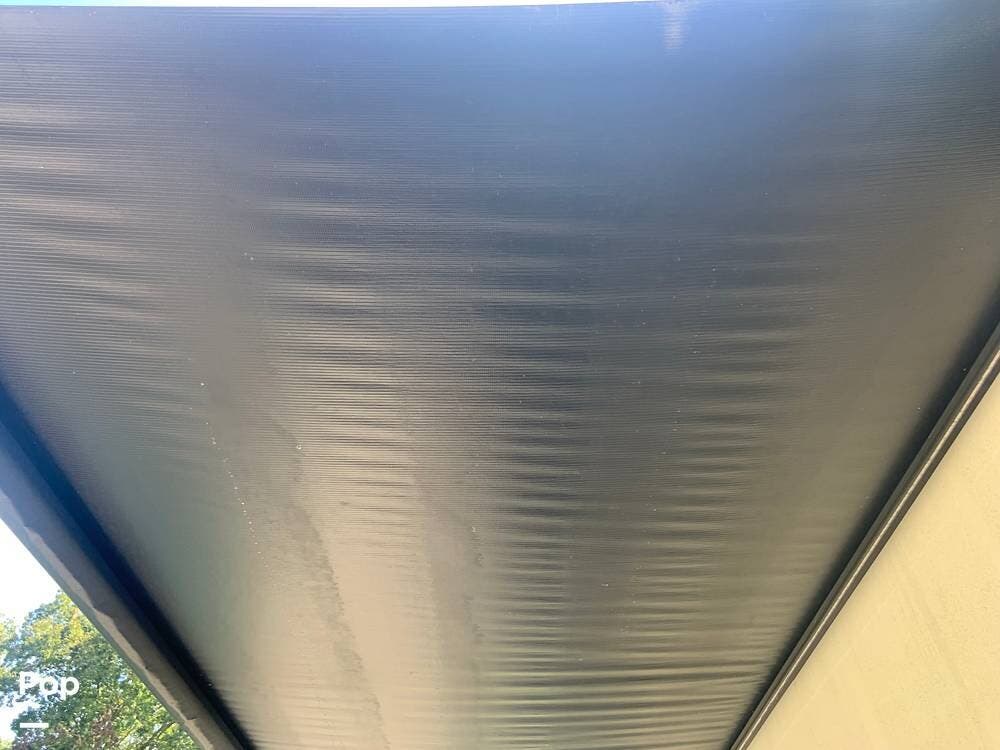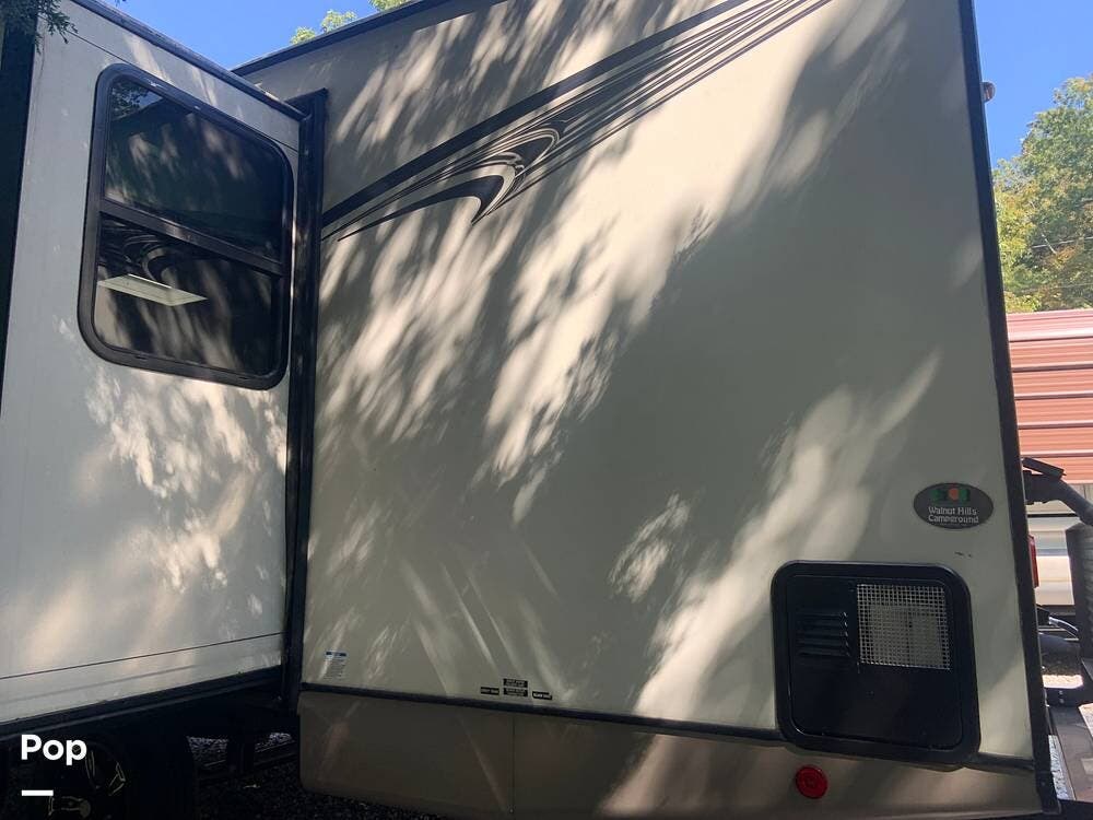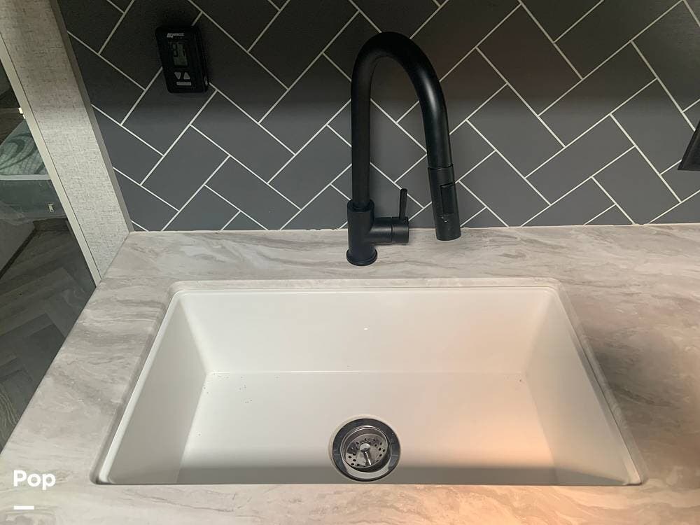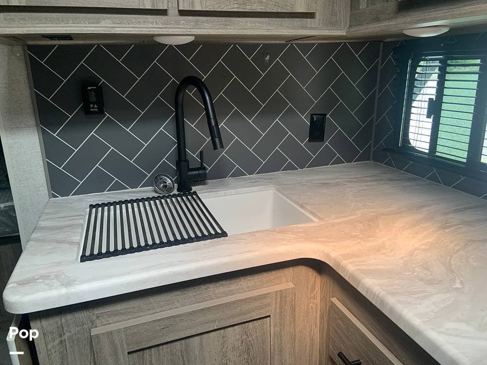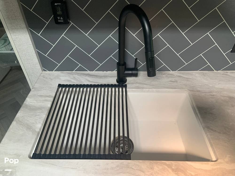 Outside, you are covered by a full 18-foot patio awning and an outdoor kitchen featuring a griddle and mini fridge. The camper also has a large pass-through basement storage compartment protected by locking heavy-duty latches.