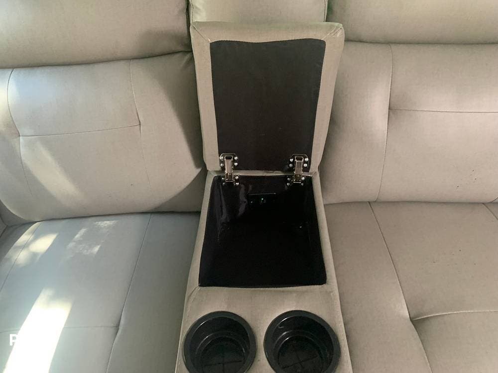 The cafe-style kitchen has a full assortment of appliances, including a conventional oven, and offers an abundance of cabinetry and counter space. There is also a large pantry that the seller has custom outfitted with organizers for mops, brooms, fishing rods etc. that stay put while travelling down the road.