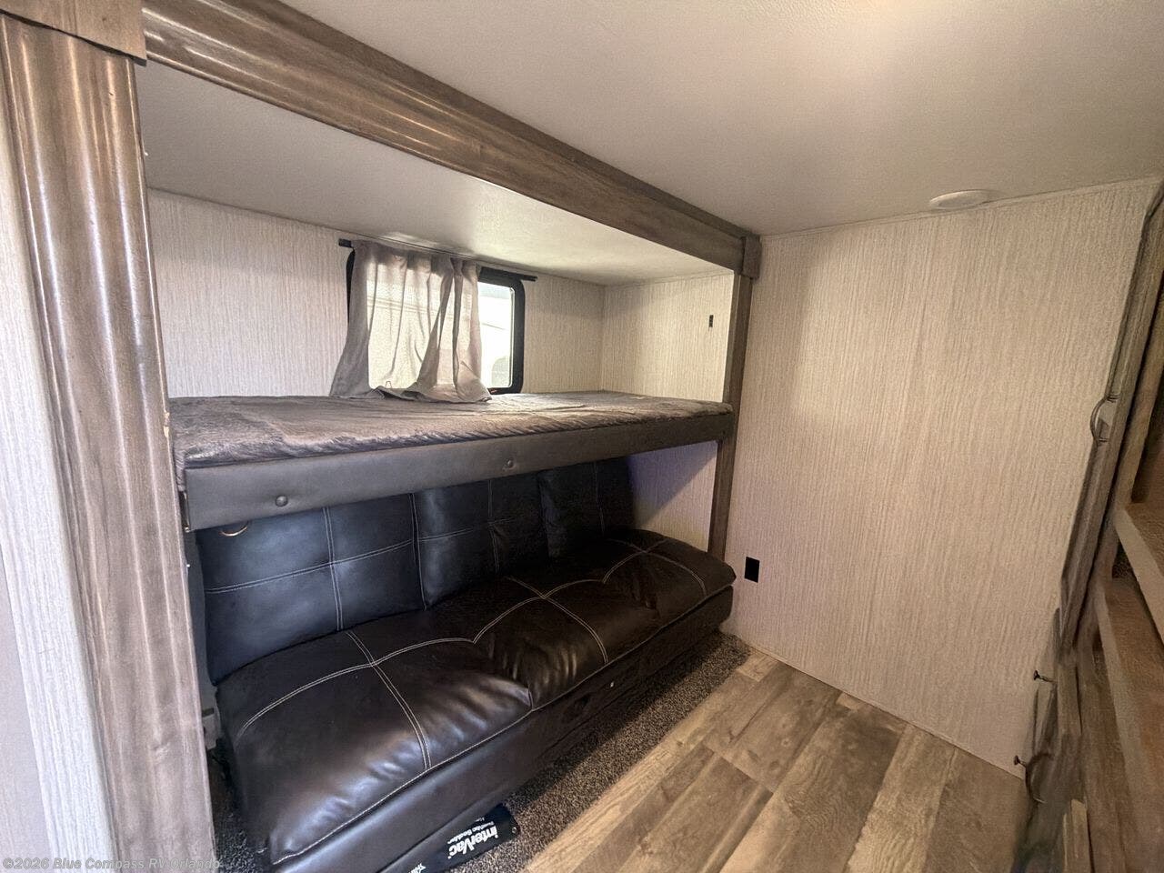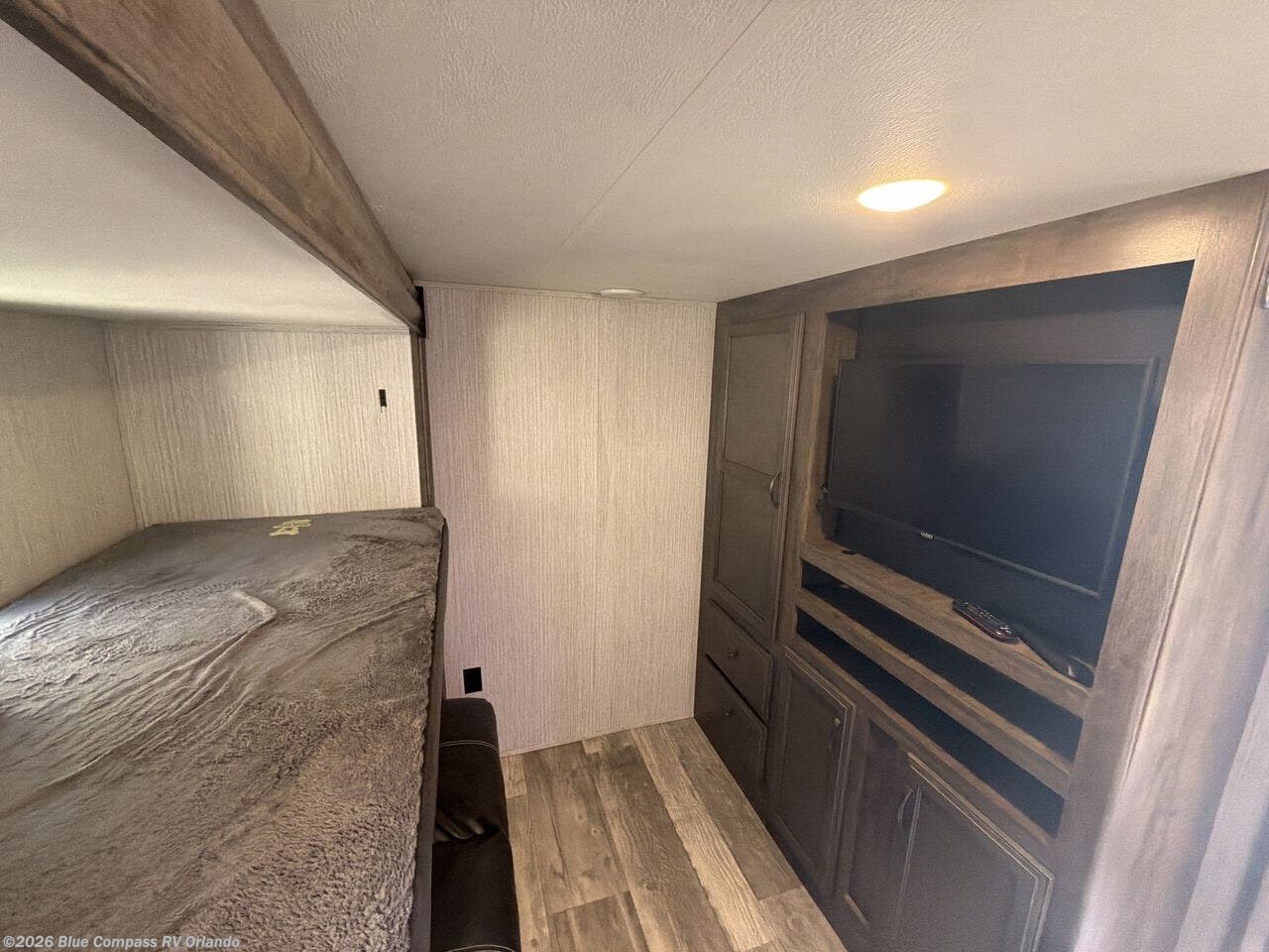 For the family-friendly fifth wheel that you've always wanted, look no further than this Sandpiper by Forest River. You will enjoy the convenience of having two kitchens - one inside and one outside. Almost straight in from the door is the second bedroom which can easily double as a den. Above this room is a loft which features sleeping space for two people. In the combined kitchen and living area there is an island with pendant lights above and extra counter space to make meal prep run smoothly. You can easily relax in this living area with an entertainment center, fireplace, and theater seating!
