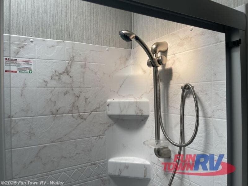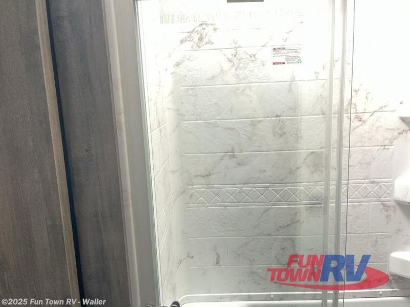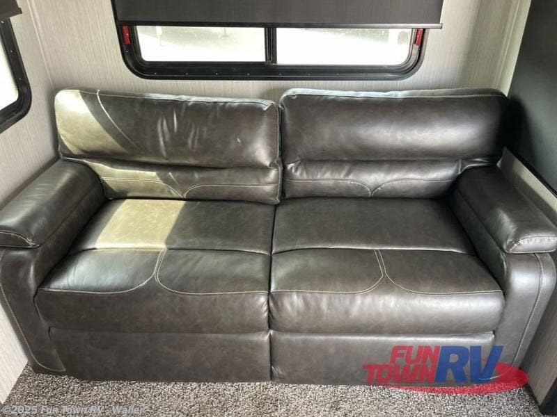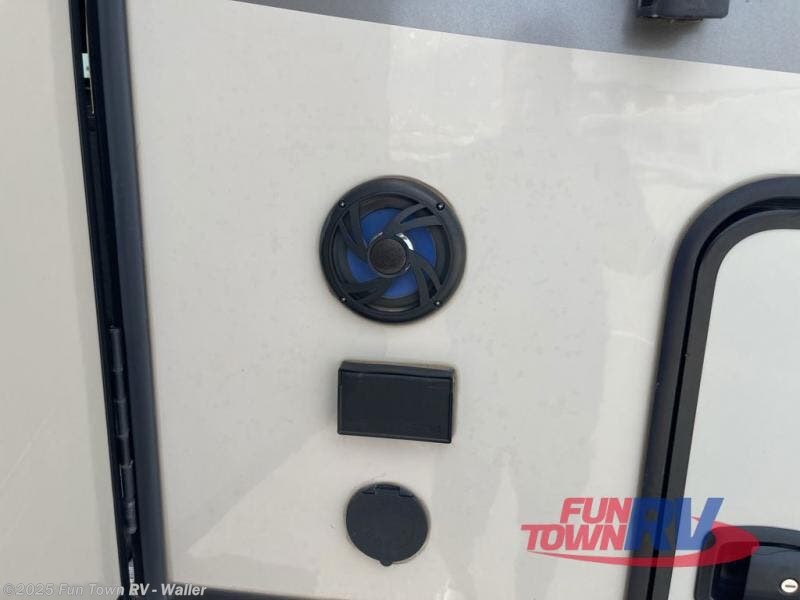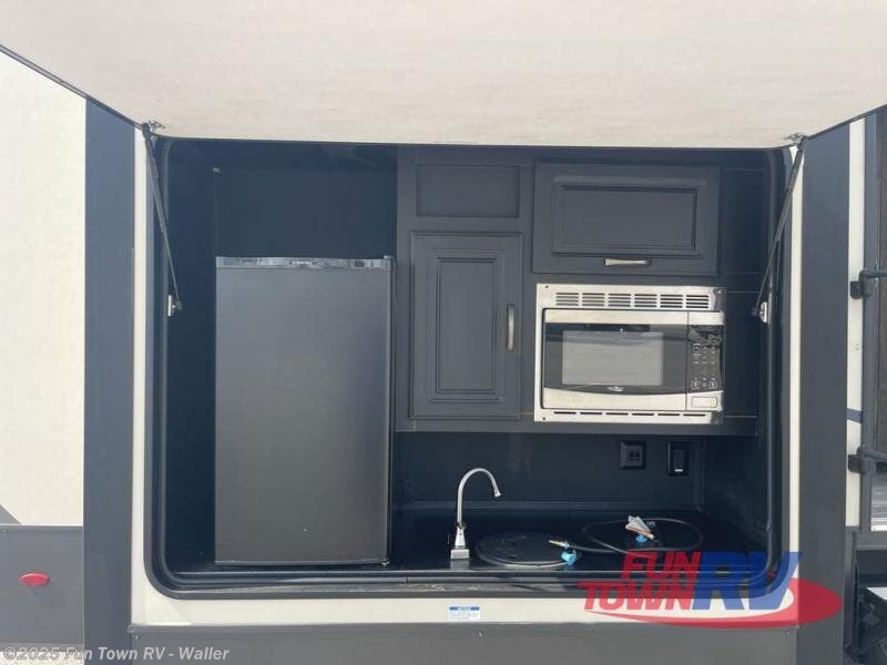 Get ready for more family time and new experiences when you choose to camp with this six slide Sandpiper fifth wheel. The exterior kitchen allows more time outdoors with your family and features a refrigerator and microwave. The unique front kitchen is spacious and accommodating with opposing slides, an island, and a dinette with two chairs. In the spacious bathroom is a large walk-in shower with a seat, plus a closet that has been prepped for an optional washer and dryer. With two entry doors into this model, you can easily slip out the rear door and head out for an early morning fishing trip!